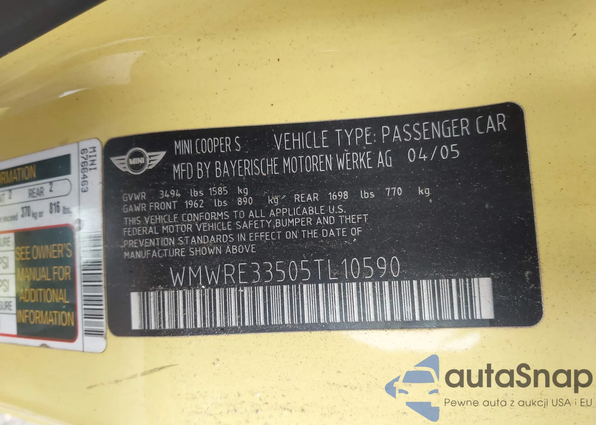 2005 Mini Cooper S z USA, uszkodzony, nr VIN WMWRE33505TL10590
