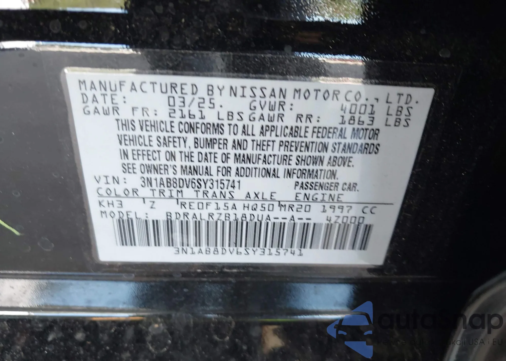 • VIN 3N1AB8DV6SY315741