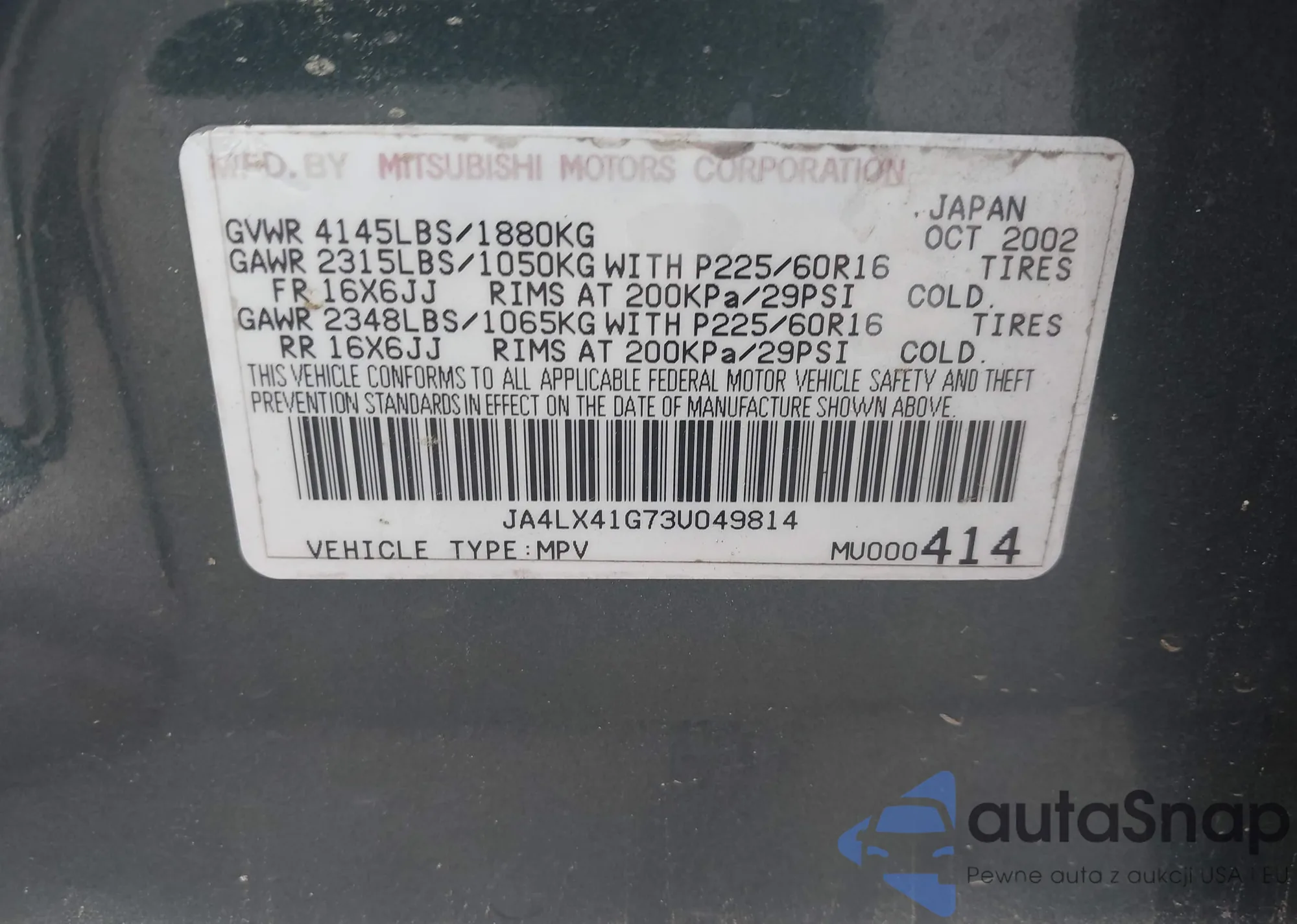 LOT: 42348988 VIN: JA4LX41G73U049814