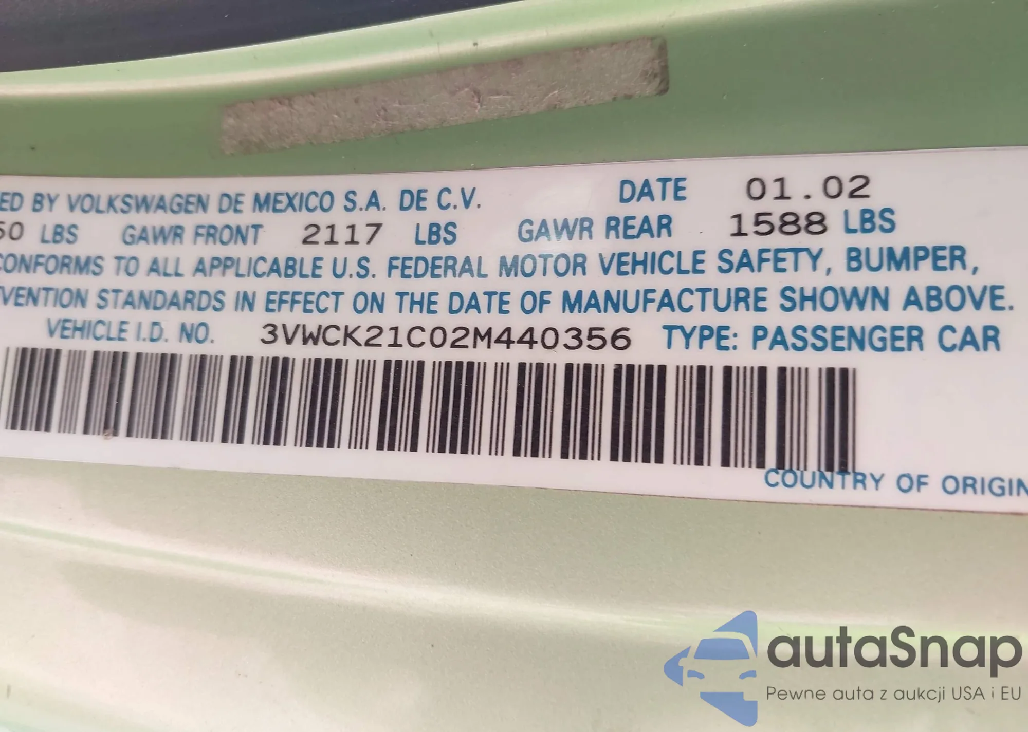 • VIN 3VWCK21C02M440356
