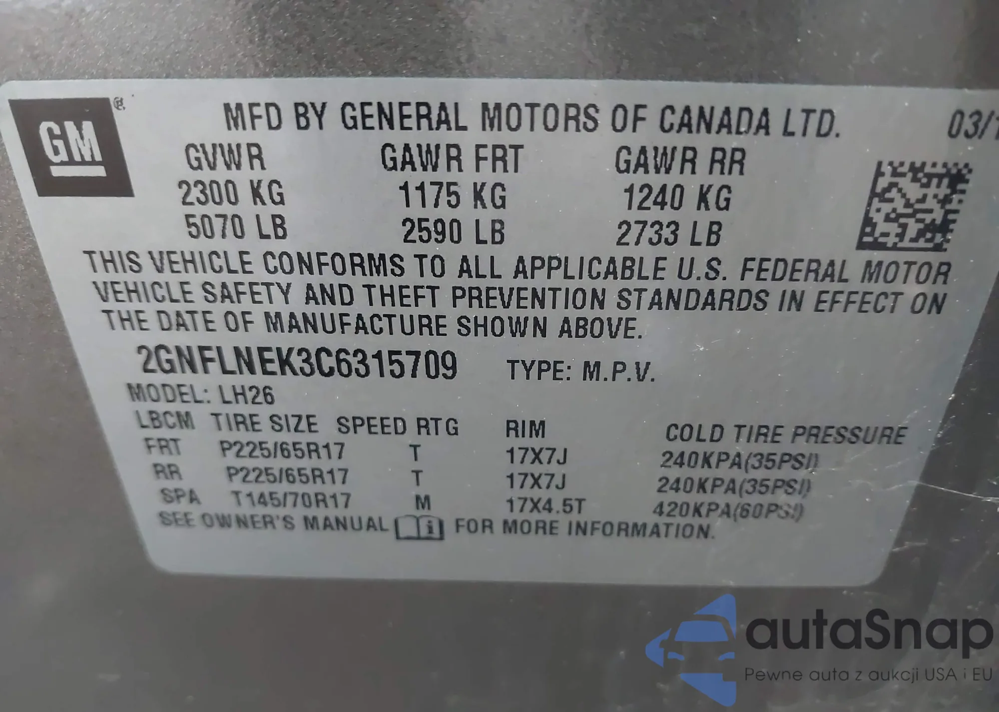• VIN 2GNFLNEK3C6315709