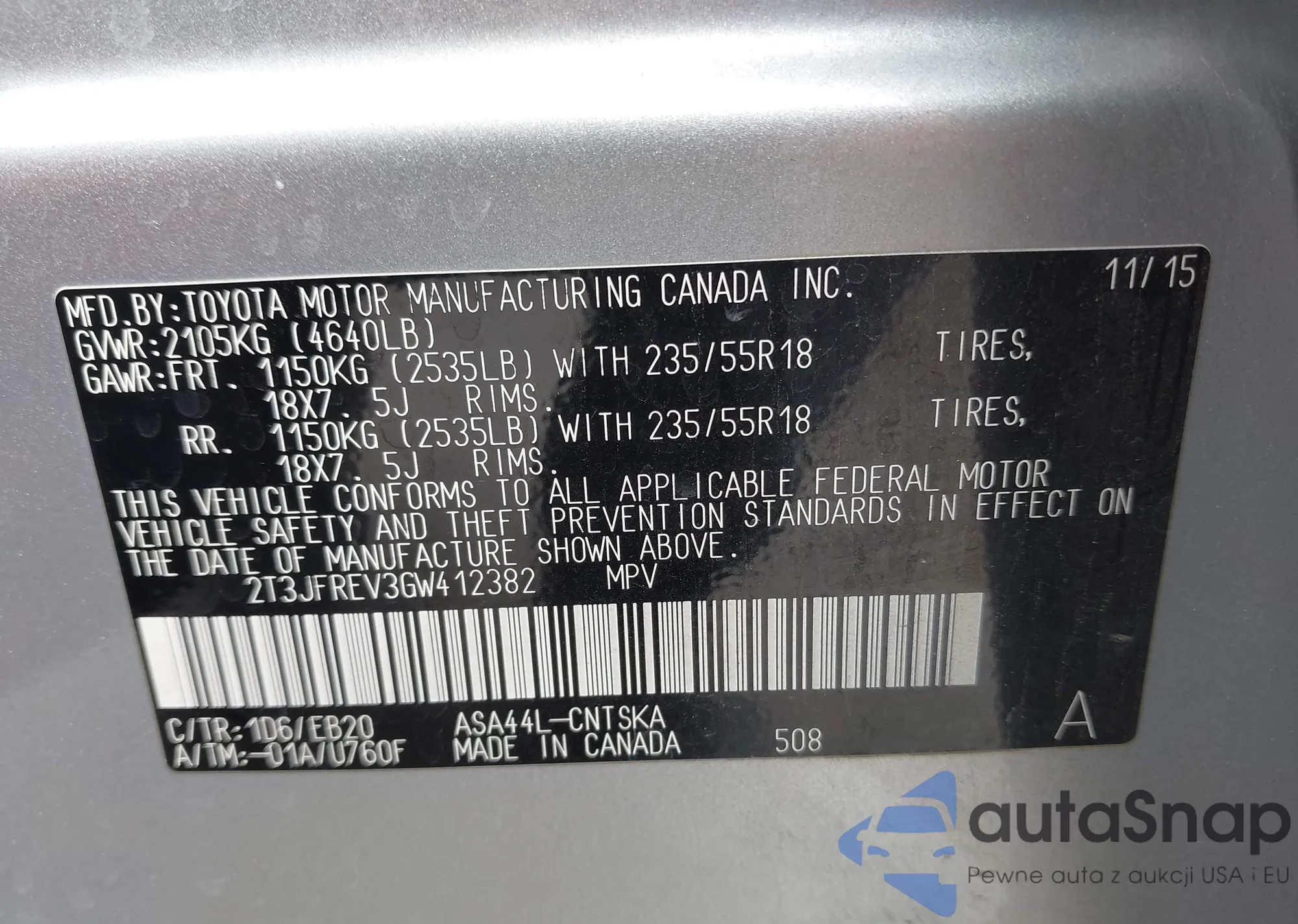LOT: 42295617 VIN: 2T3JFREV3GW412382