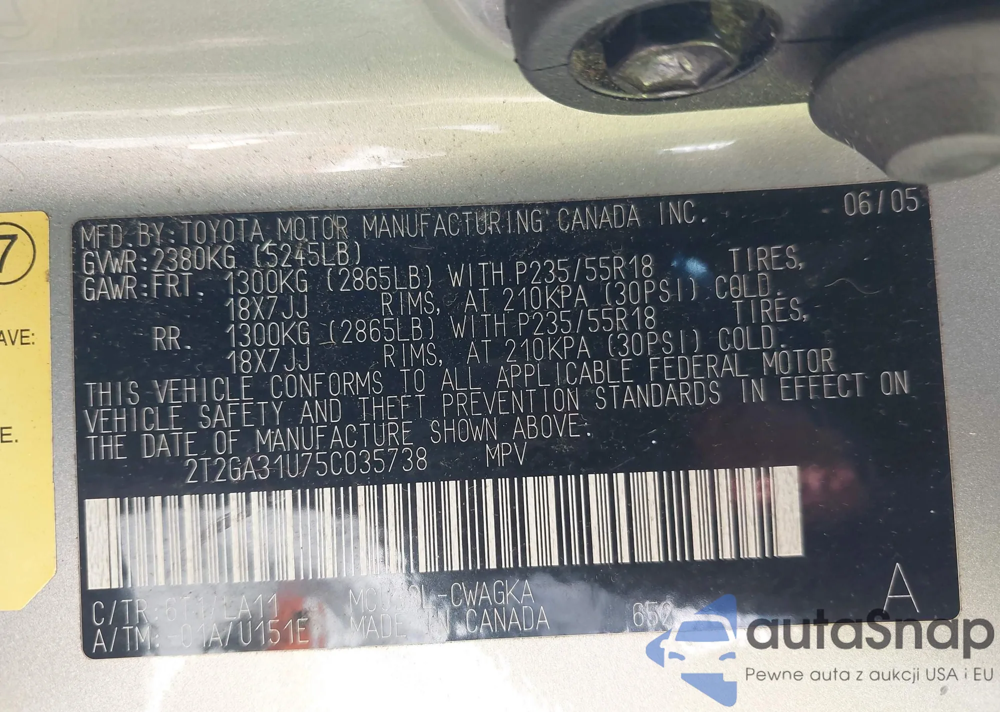 LOT: 42361326 VIN: 2T2GA31U75C035738
