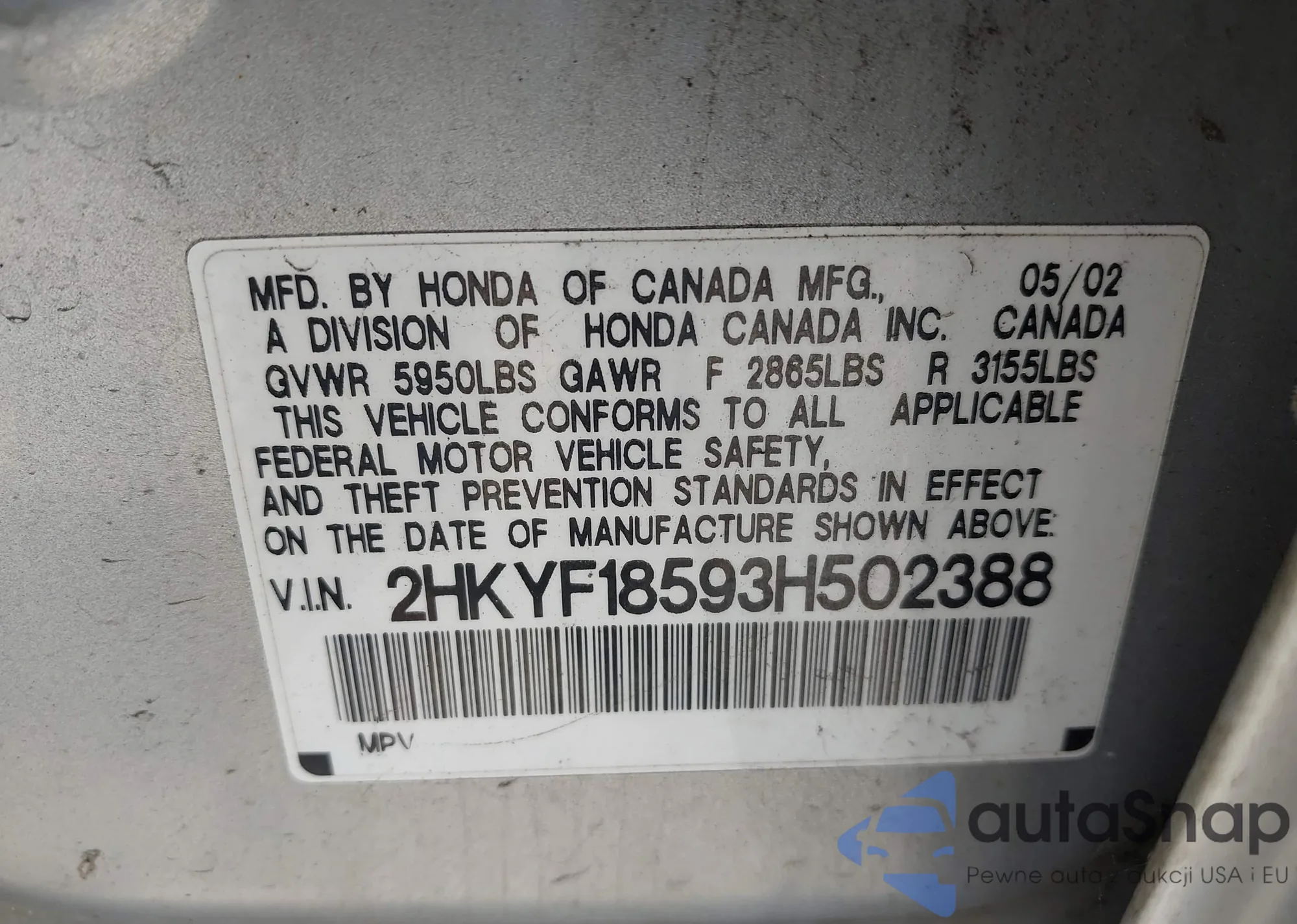 • VIN 2HKYF18593H502388