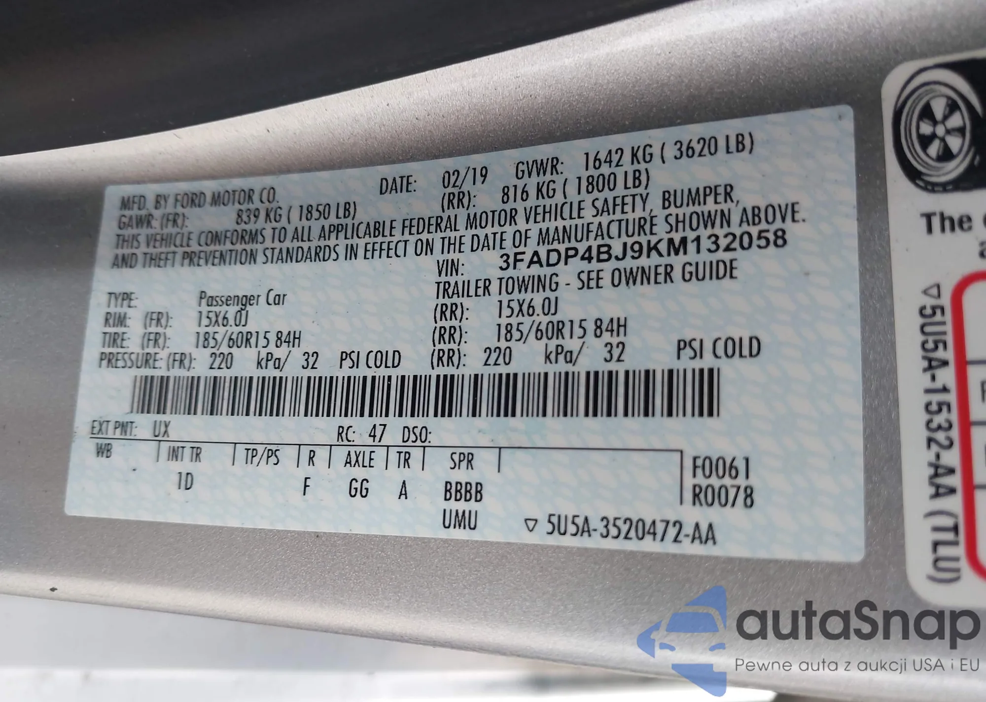 LOT: 42225864 VIN: 3FADP4BJ9KM132058
