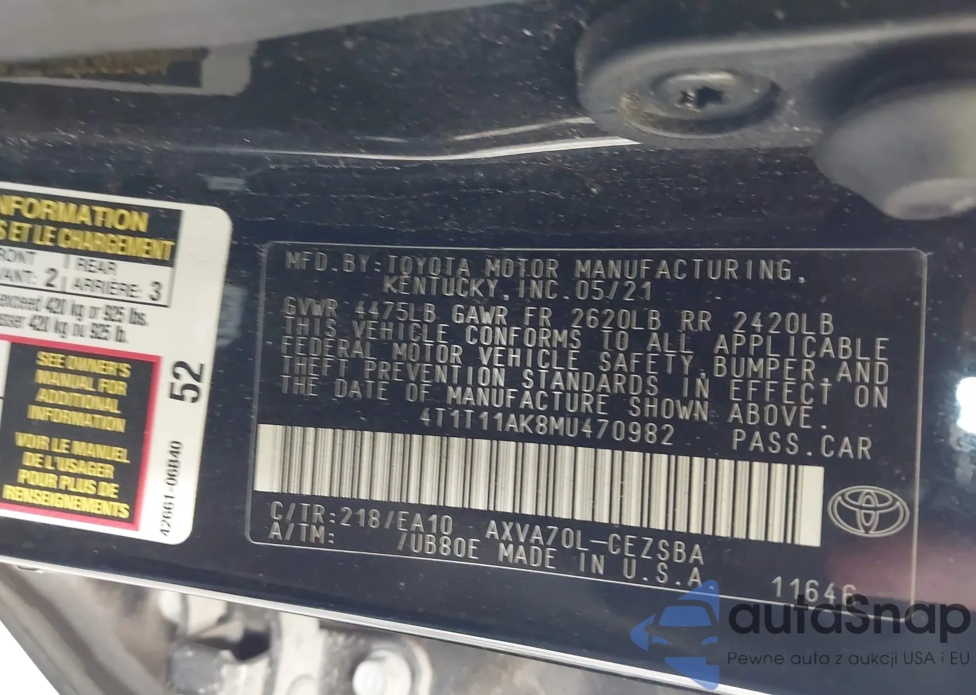 LOT: 42209396 VIN: 4T1T11AK8MU470982