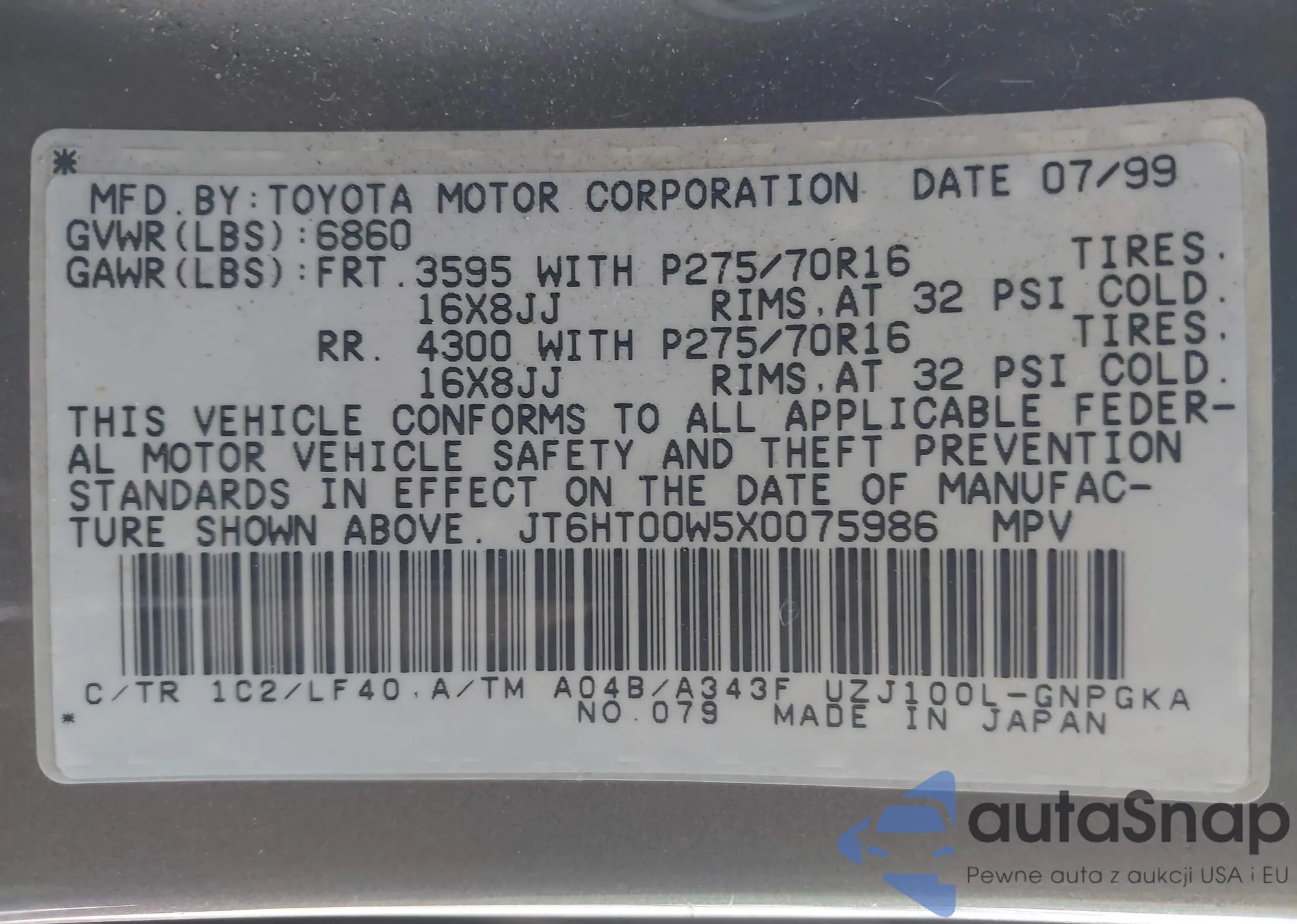 LOT: 41228035 VIN: JT6HT00W5X0075986