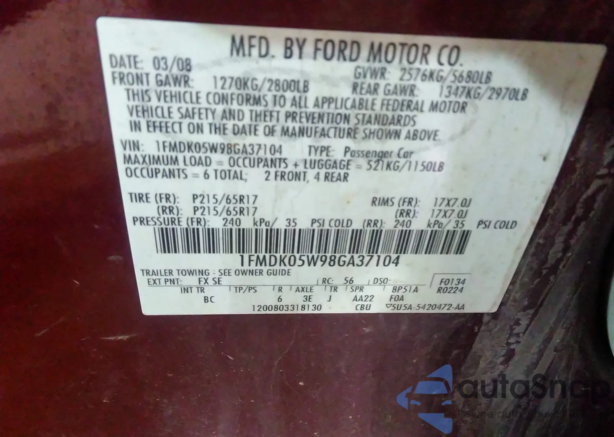 LOT: 42077577 VIN: 3FAHP0HA6CR288922