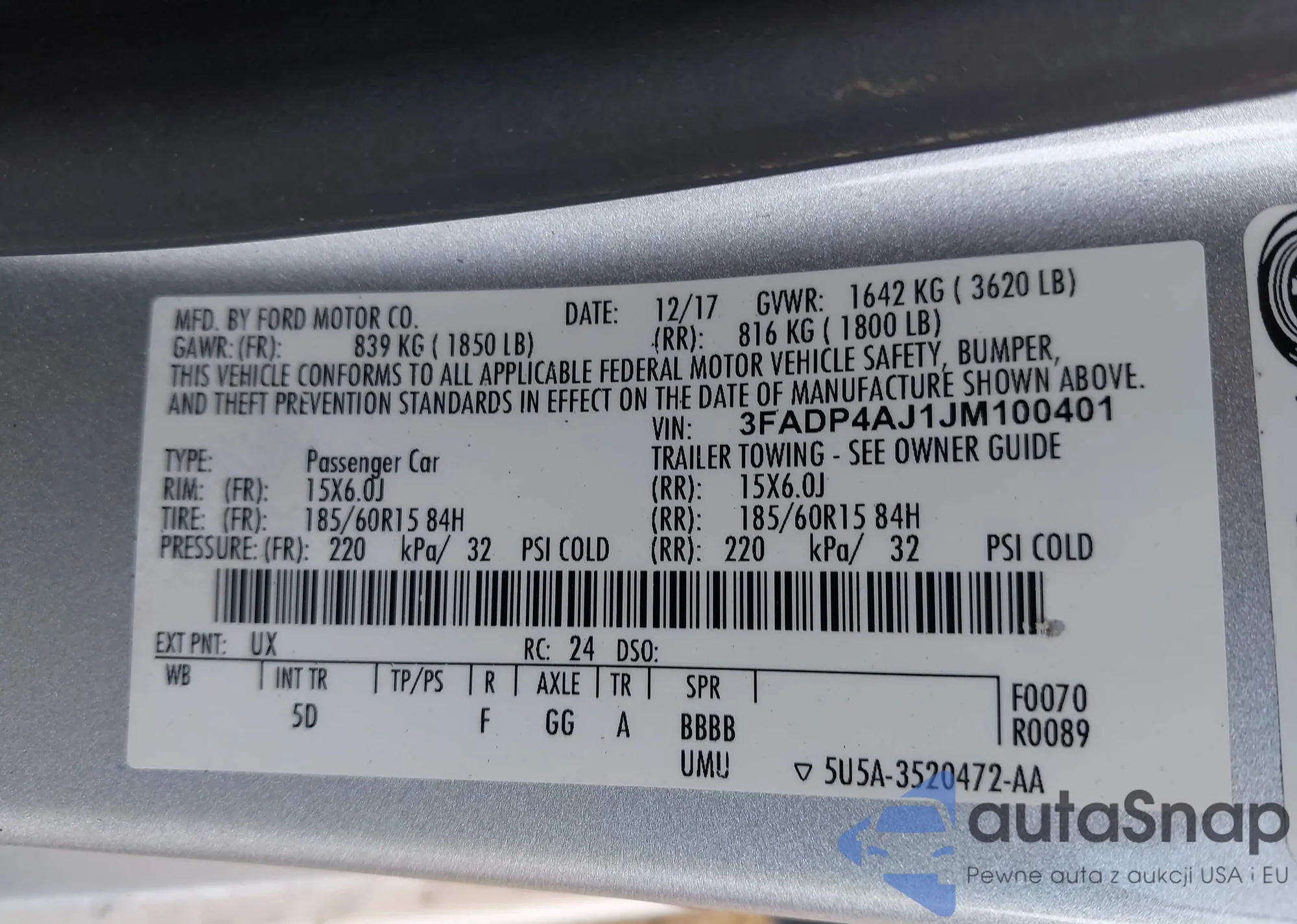LOT: 42139637 VIN: 3FADP4AJ1JM100401