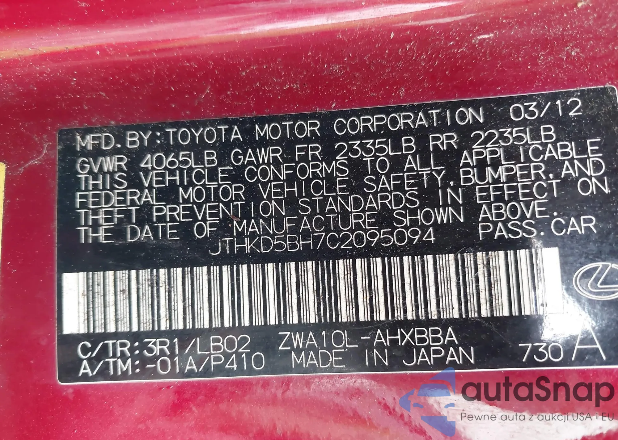 LOT: 42342431 VIN: JTHKD5BH7C2095094