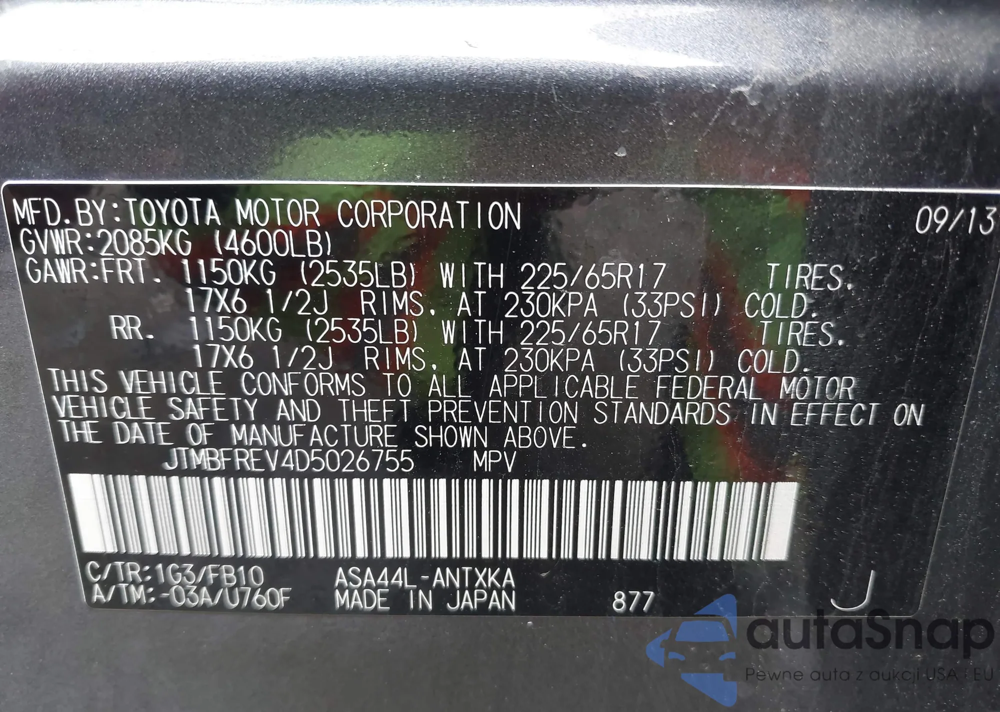 LOT: 42352209 VIN: JTMBFREV4D5026755