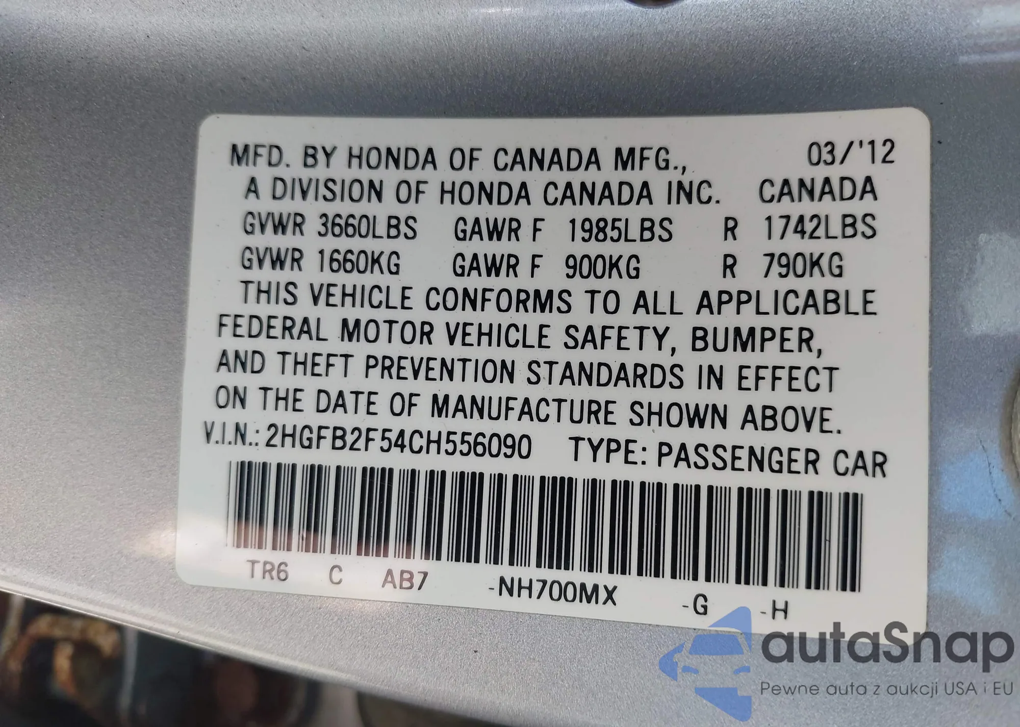 • VIN 2HGFB2F54CH556090