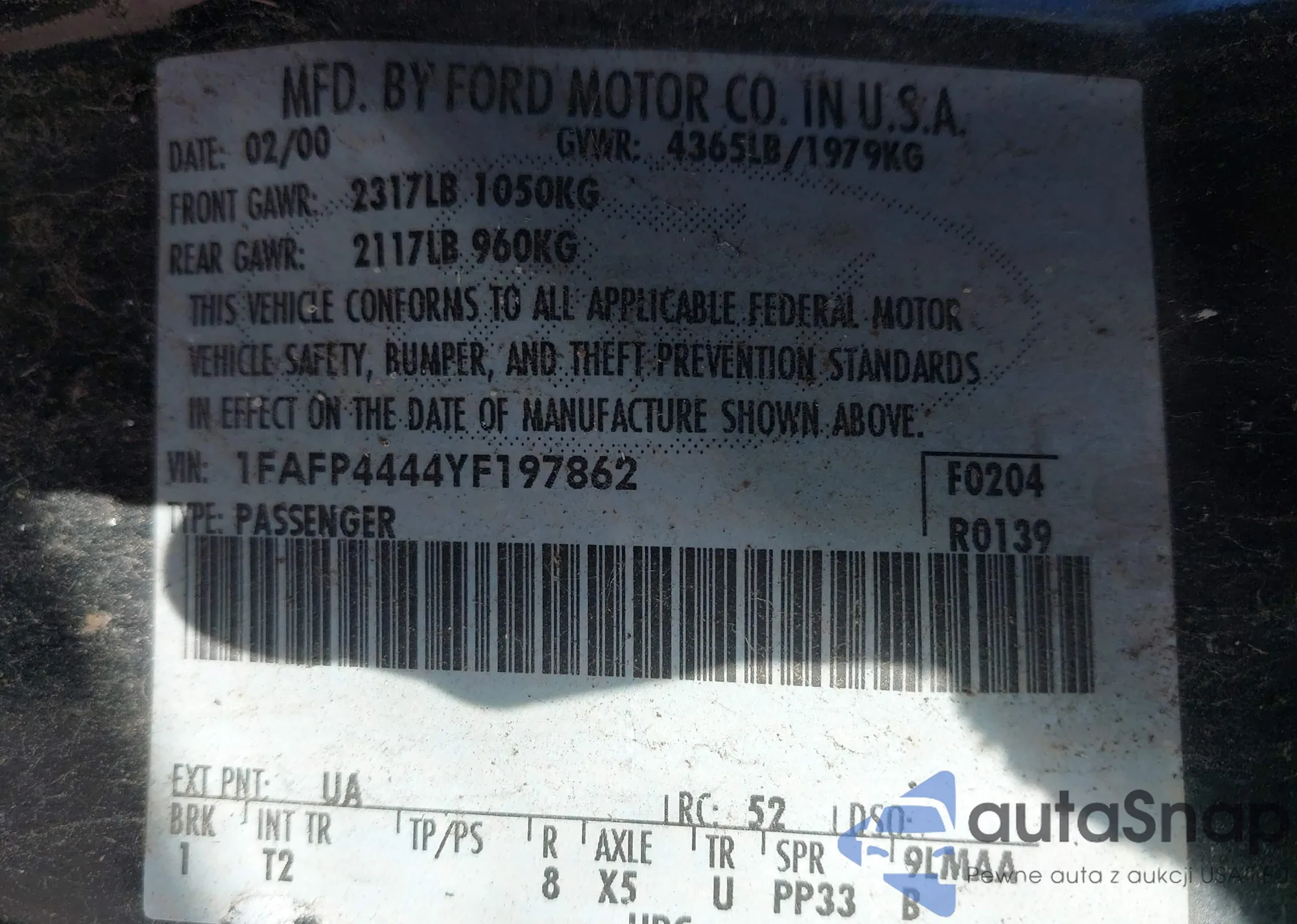 • VIN 1FAFP4444YF197862