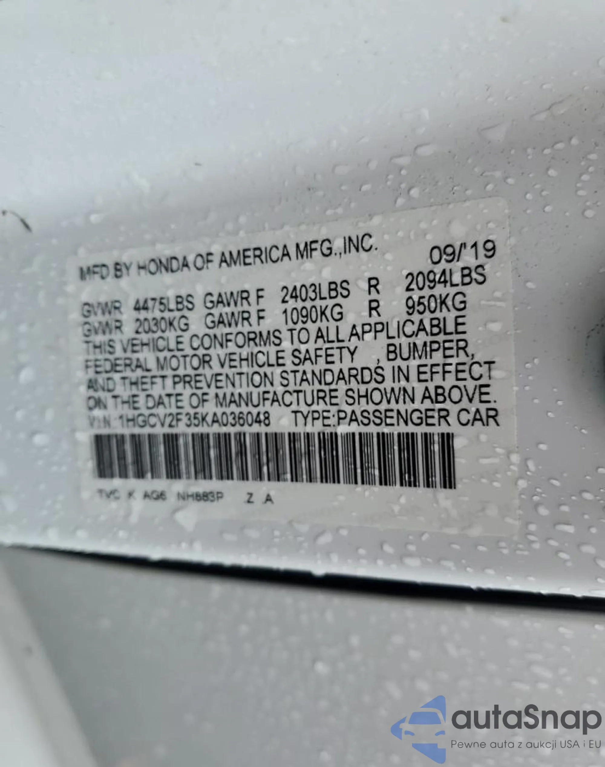 LOT: 55738075 VIN: 1HGCV2F35KA036048