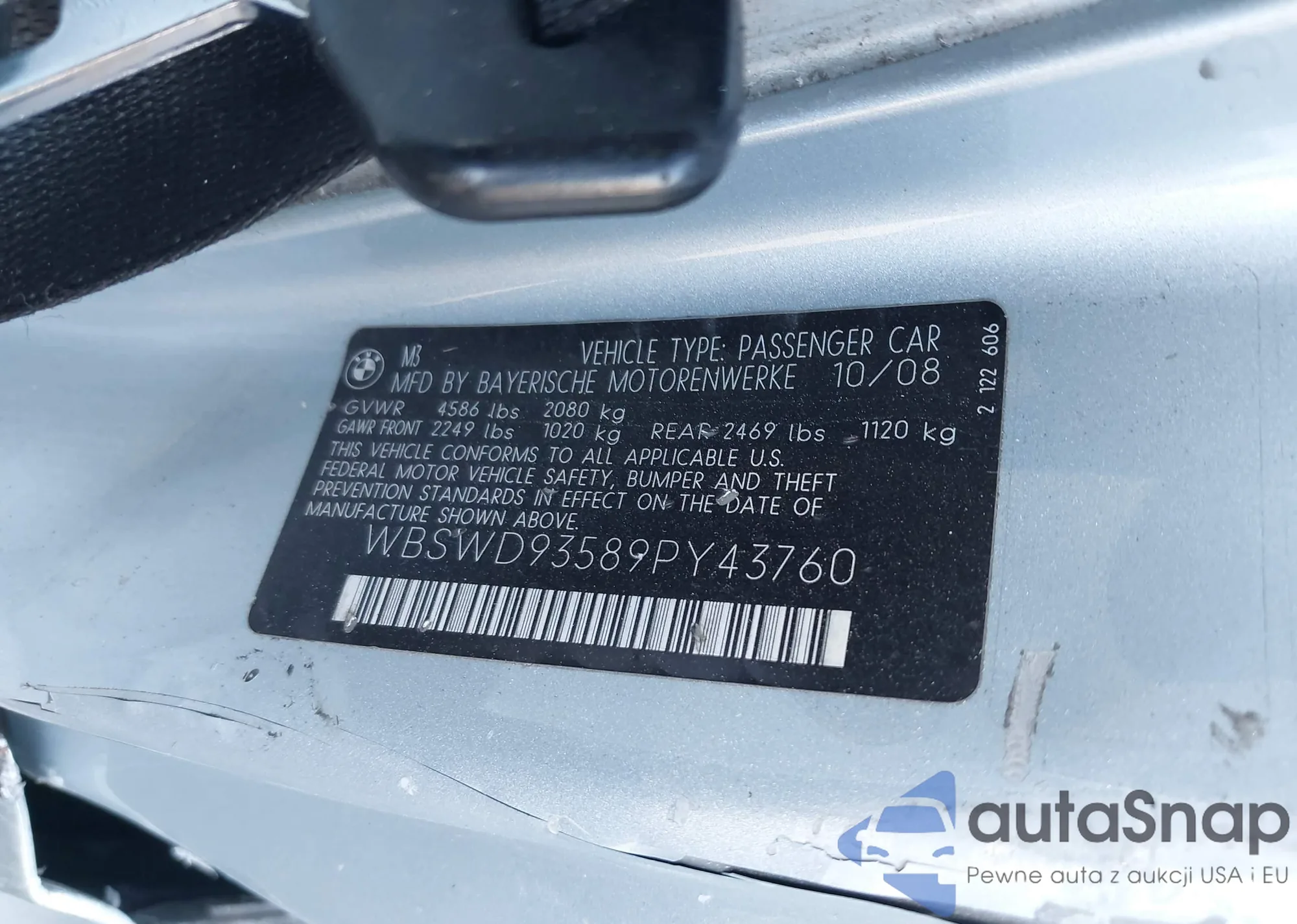 2009 BMW M3 z USA, uszkodzony, nr VIN WBSWD93589PY43760