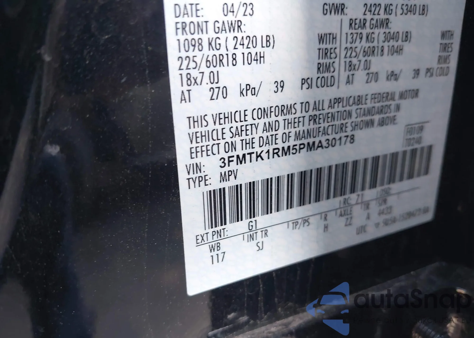 LOT: 42287333 VIN: 3FMTK1RM5PMA30178