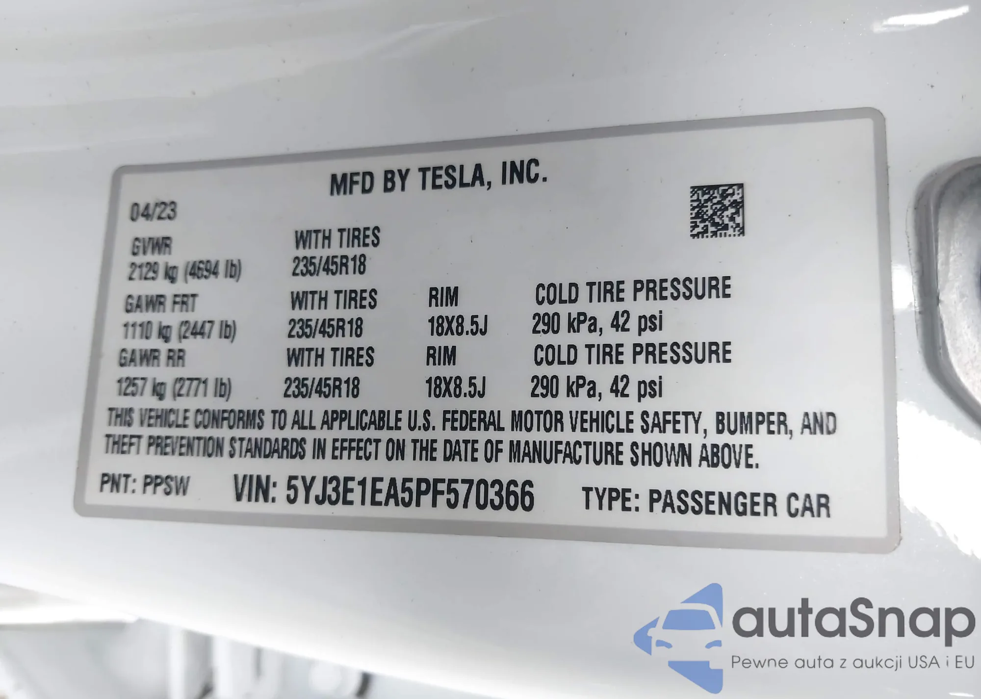 • VIN 5YJ3E1EA5PF570366