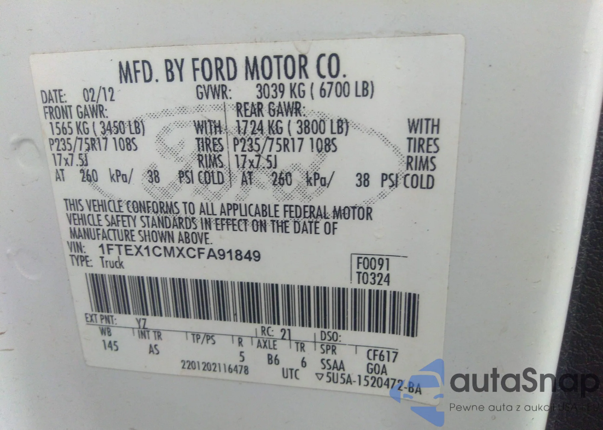 LOT: 42251570 VIN: 1FTEX1CMXCFA91849