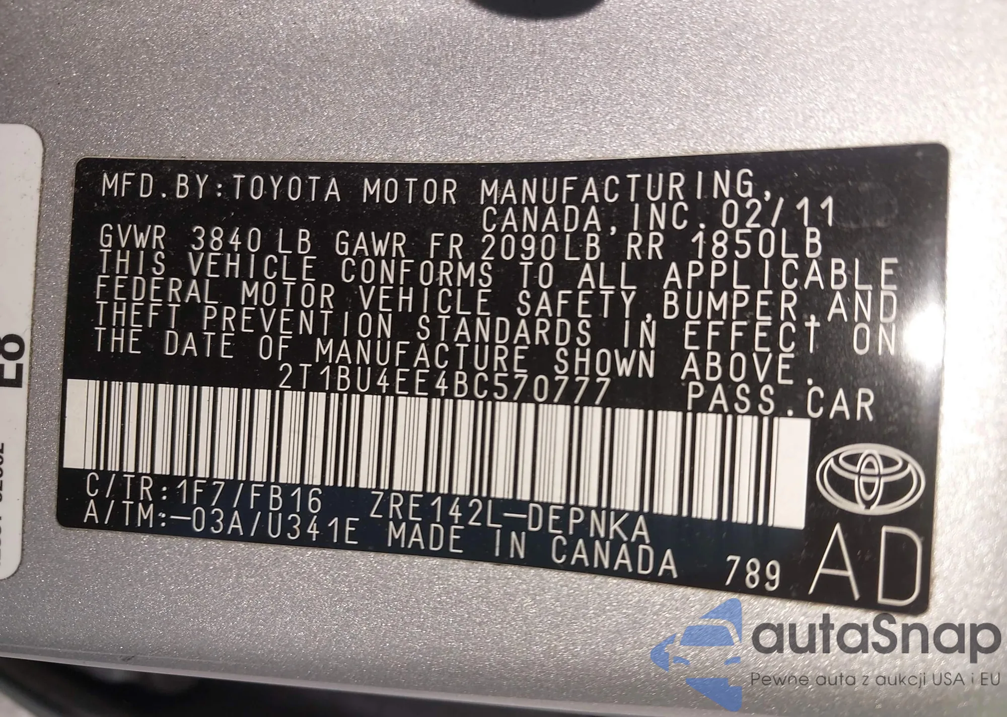 • VIN 2T1BU4EE4BC570777