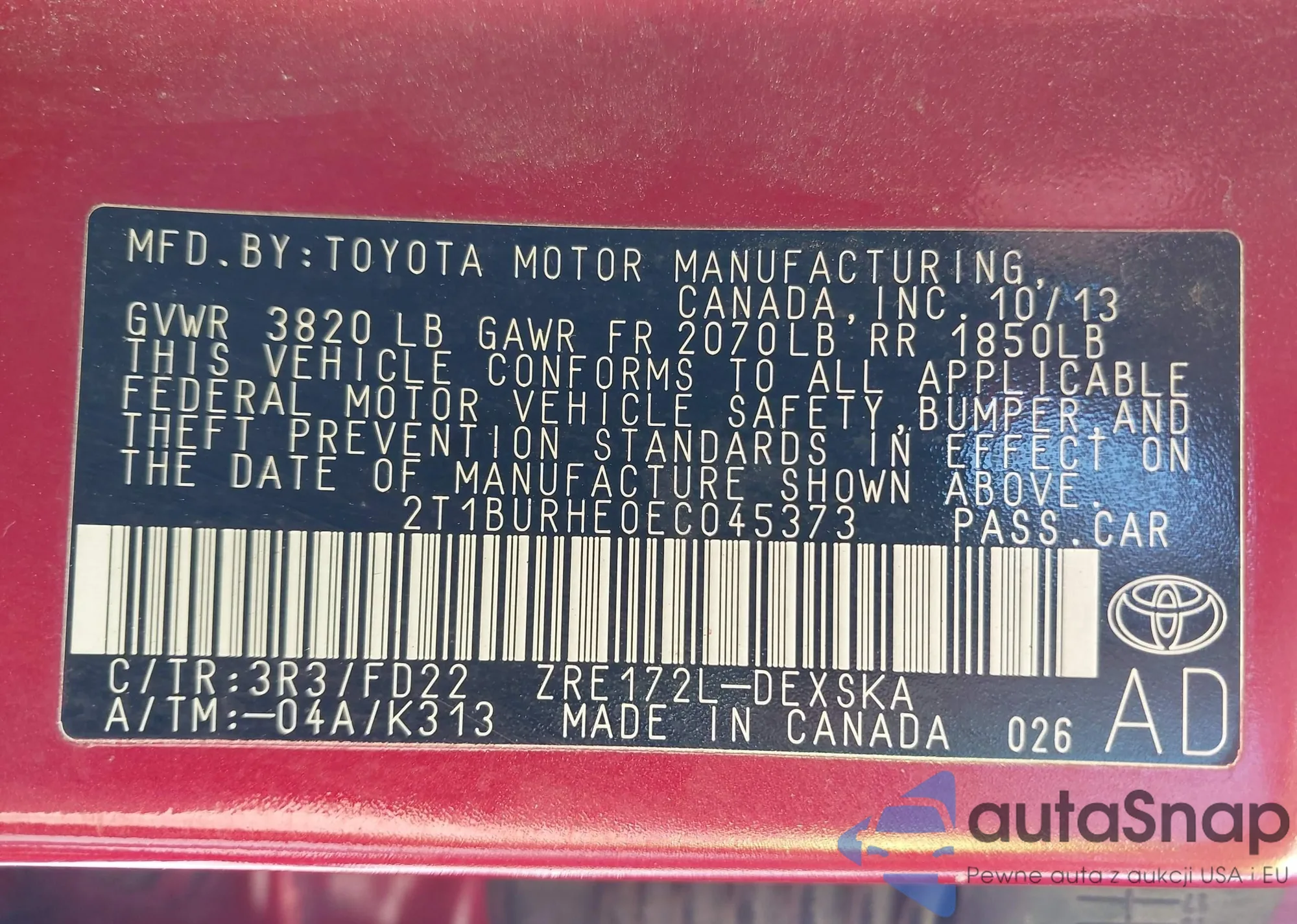 LOT: 42356987 VIN: 2T1BURHE0EC045373