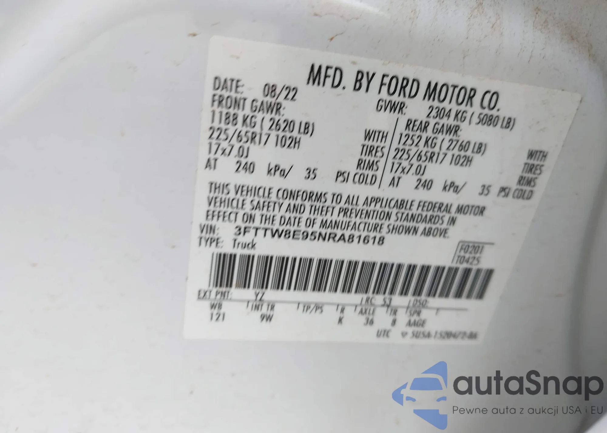 LOT: 42370160 VIN: 3FTTW8E95NRA81618