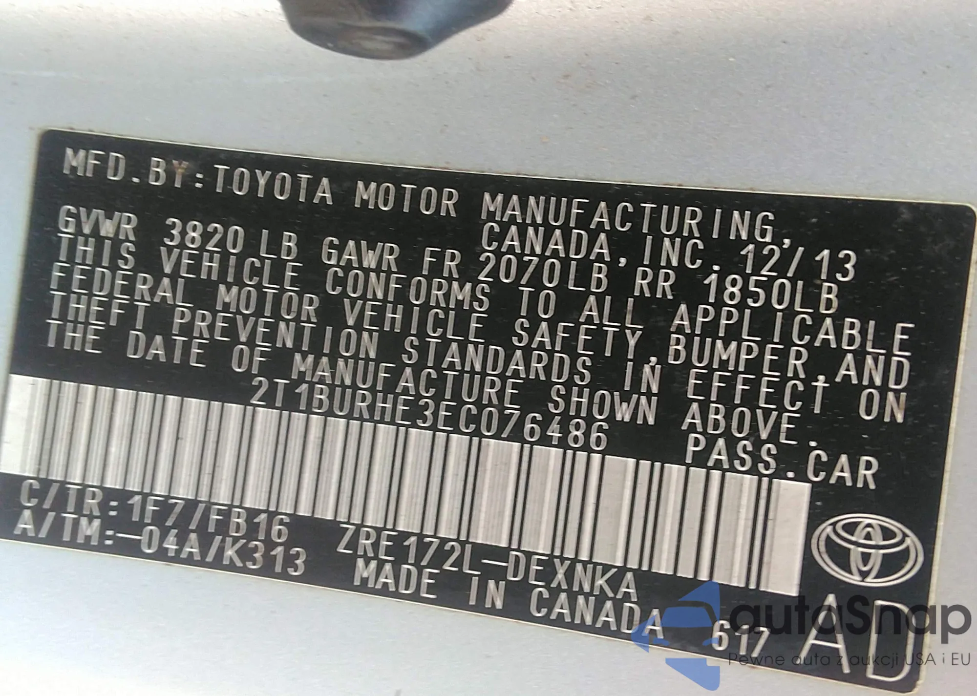 • VIN 2T1BURHE3EC076486