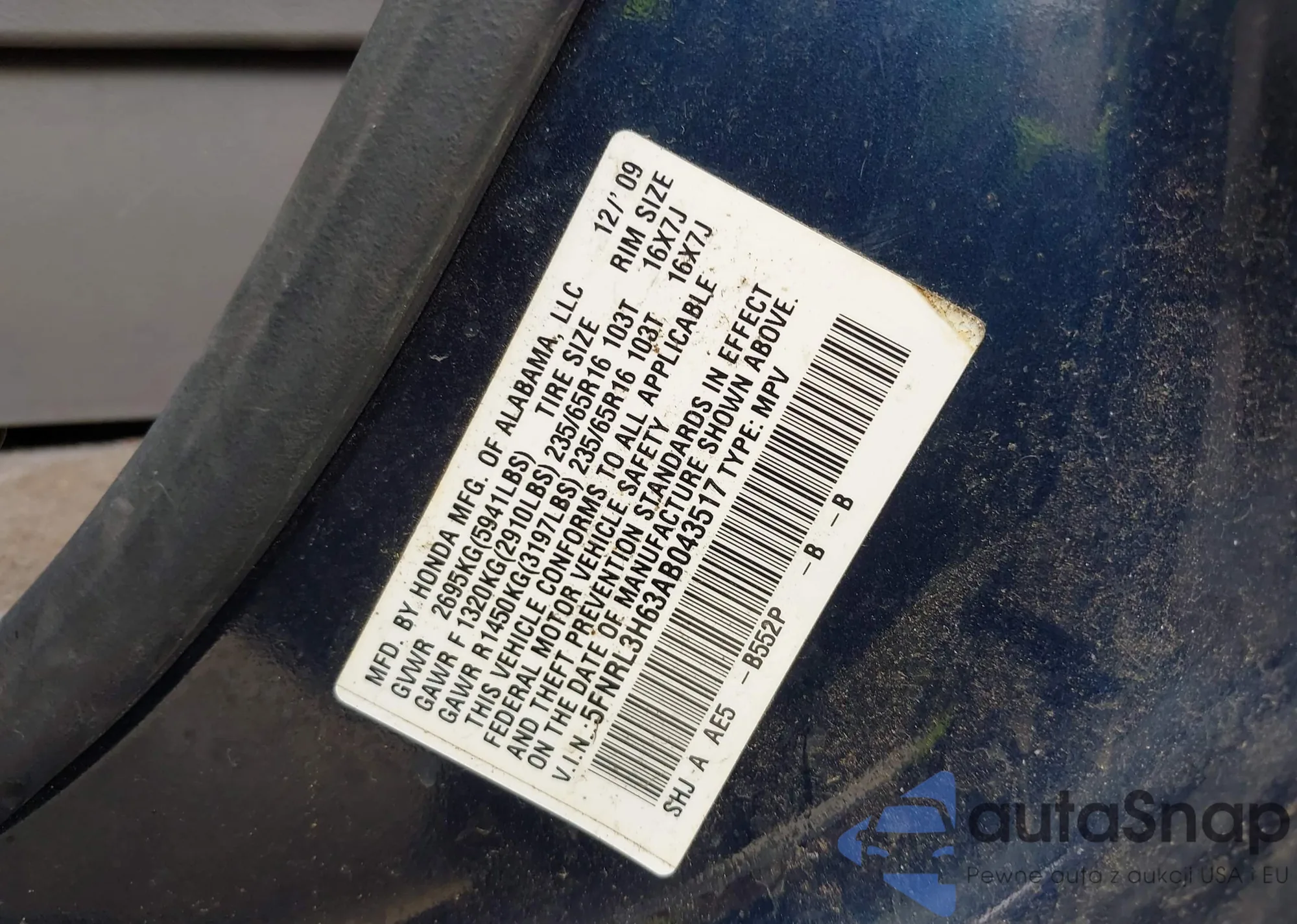 • VIN 5FNRL3H63AB043517