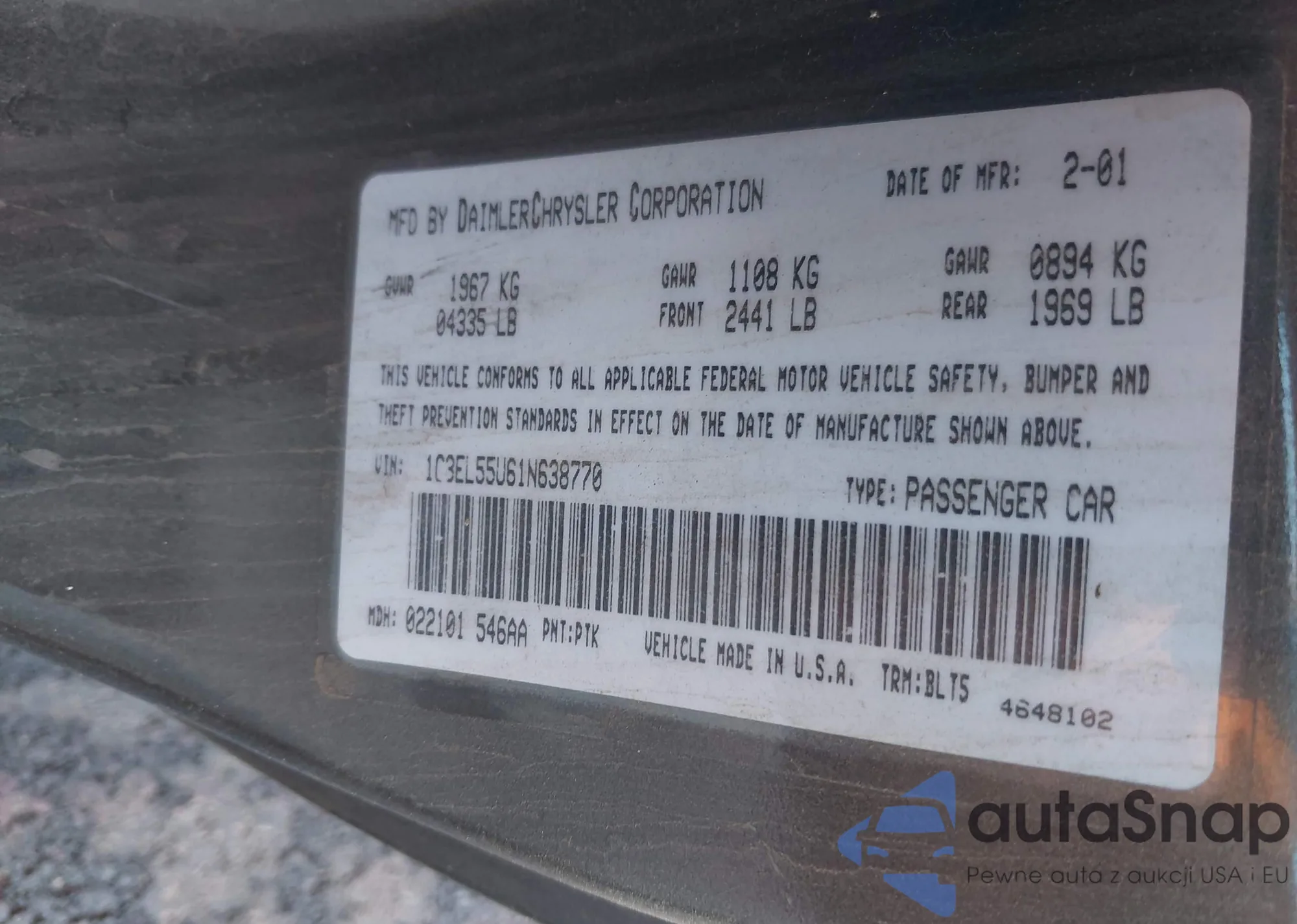 • VIN 1C3EL55U61N638770