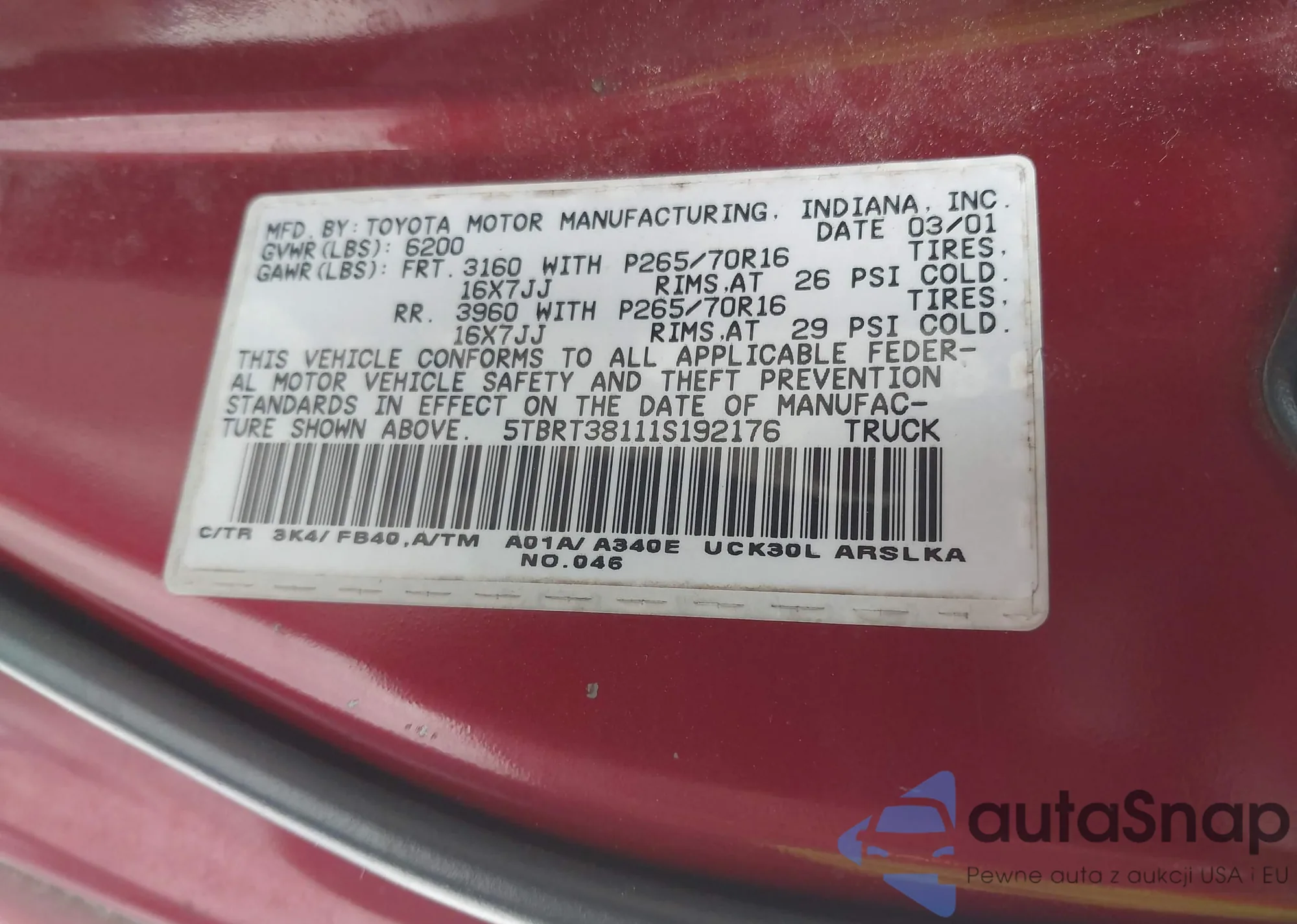 • VIN 5TBRT38111S192176