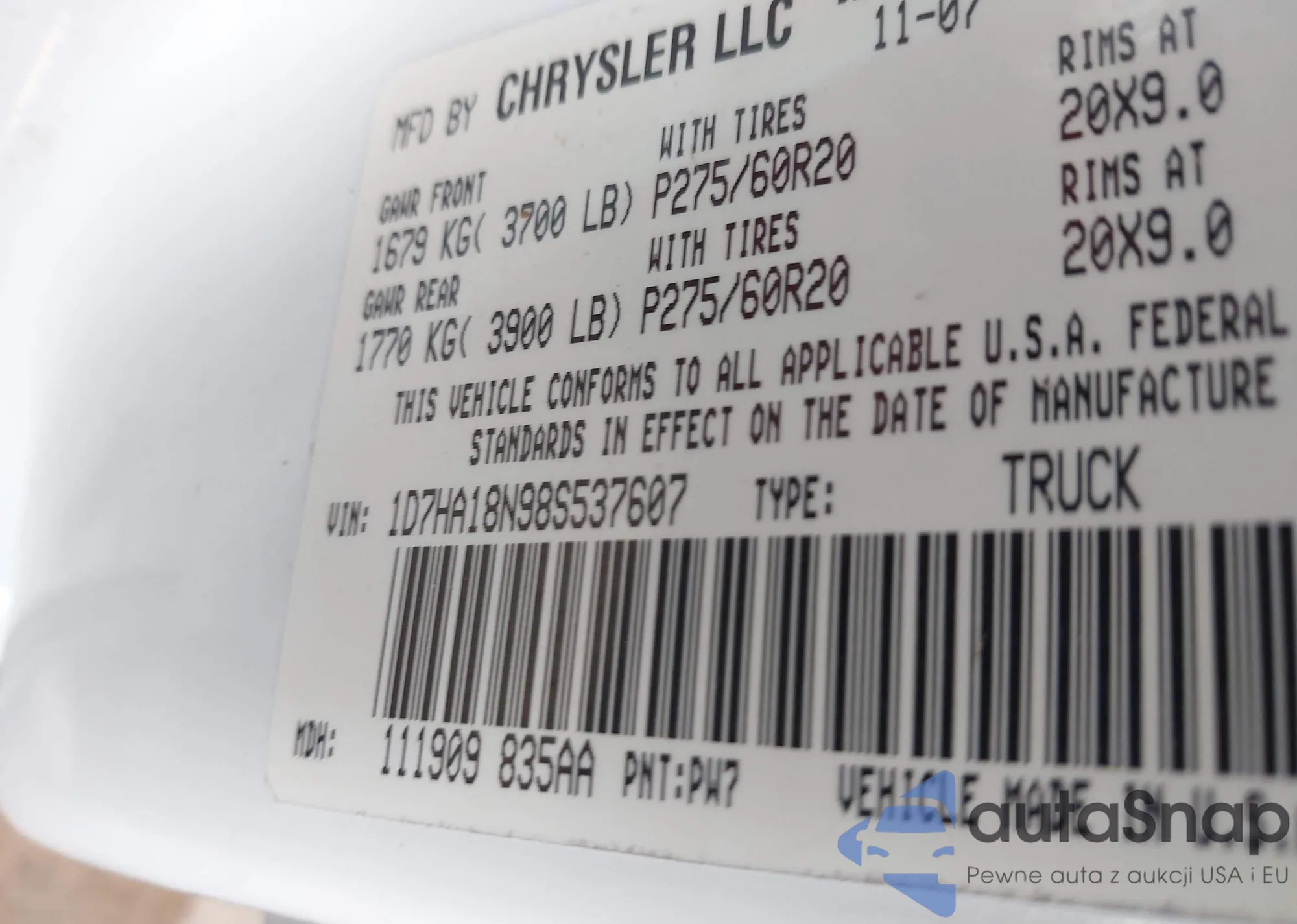 LOT: 42407171 VIN: 1D7HA18N98S537607