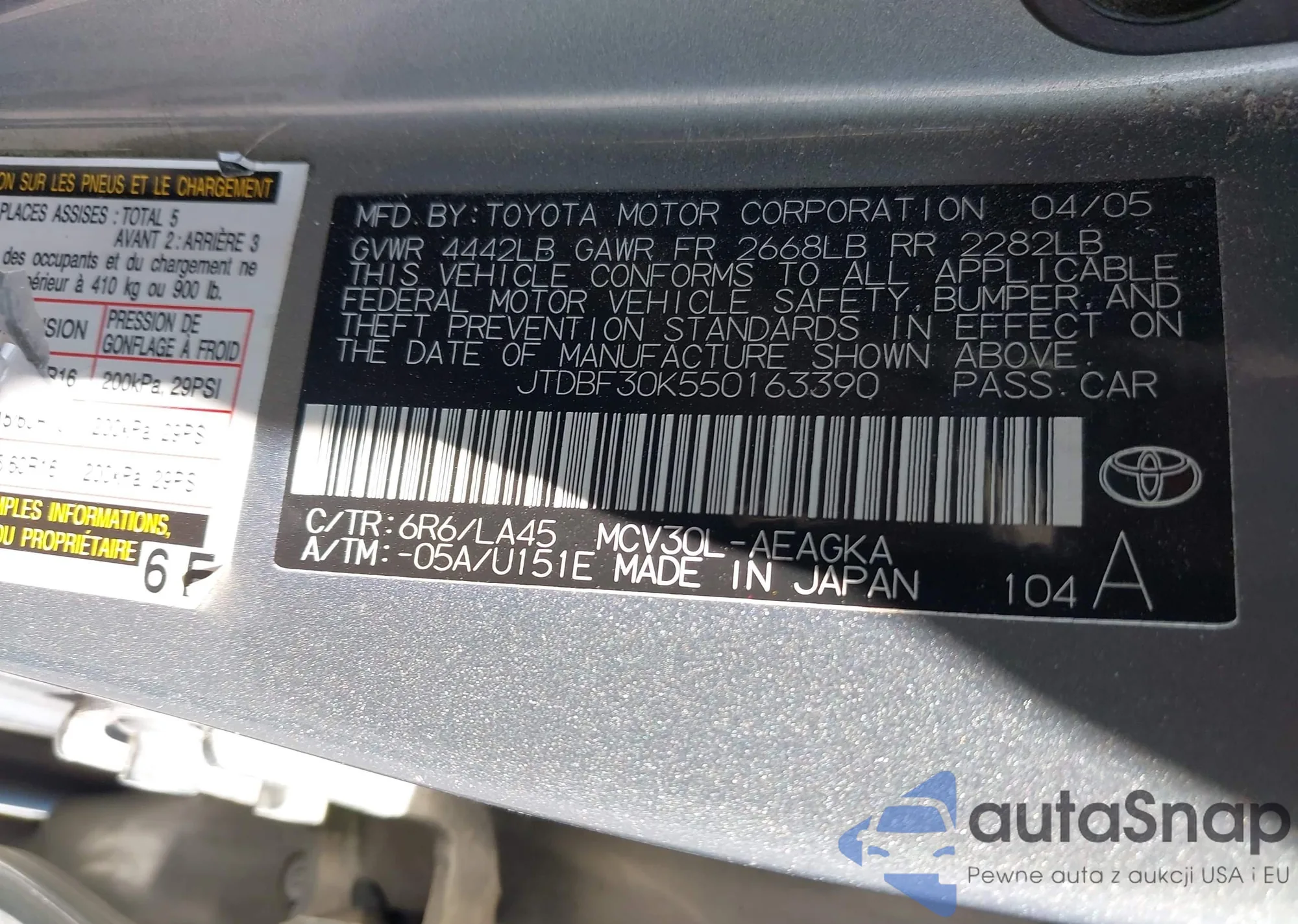 LOT: 42305785 VIN: JTDBF30K550163390