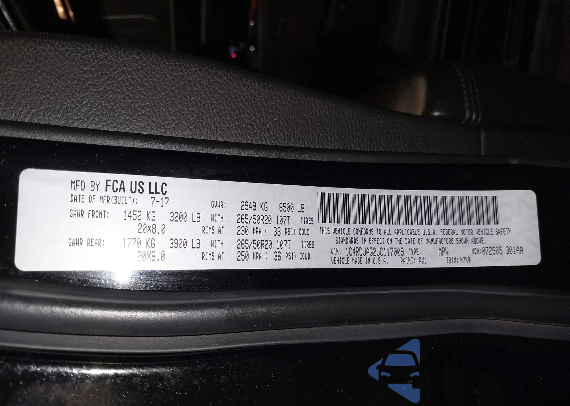 • VIN 1C4RDJAG2JC117009