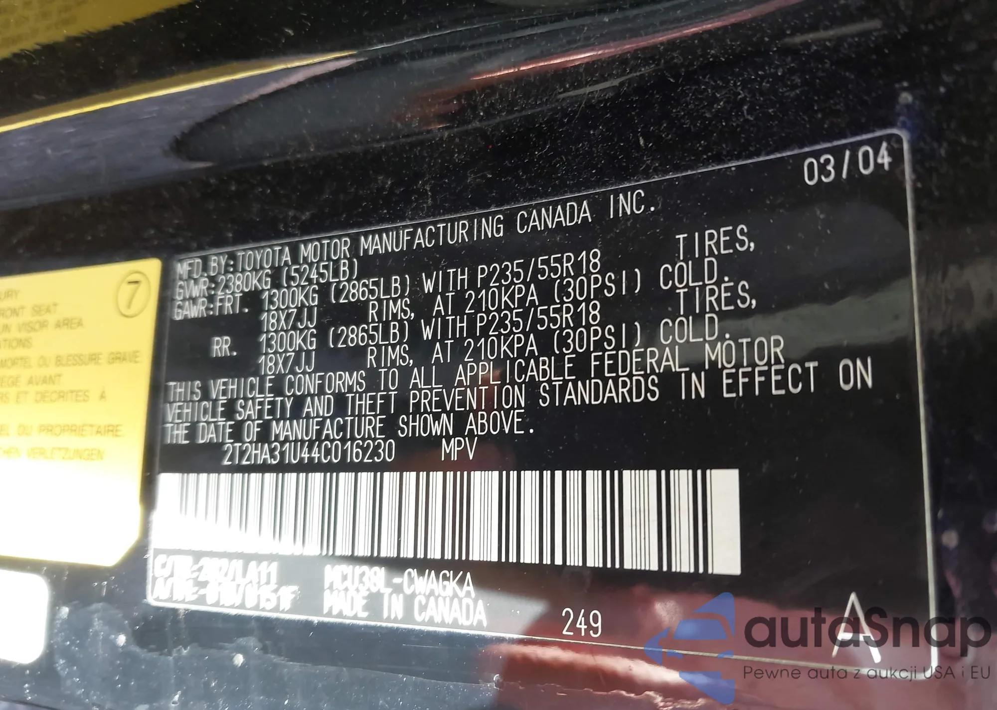 • VIN 2T2HA31U44C016230