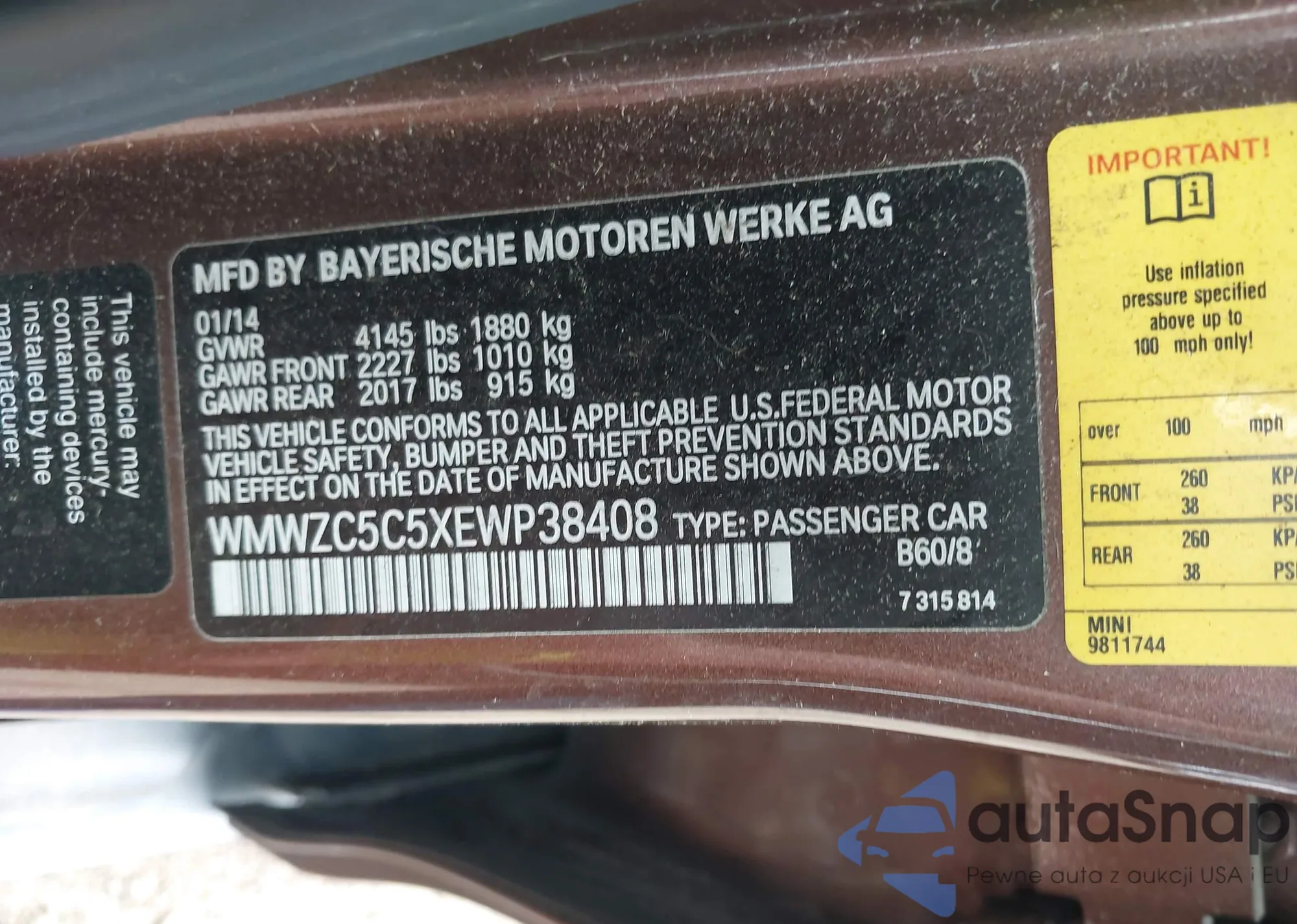 LOT: 42360746 VIN: WMWZC5C5XEWP38408