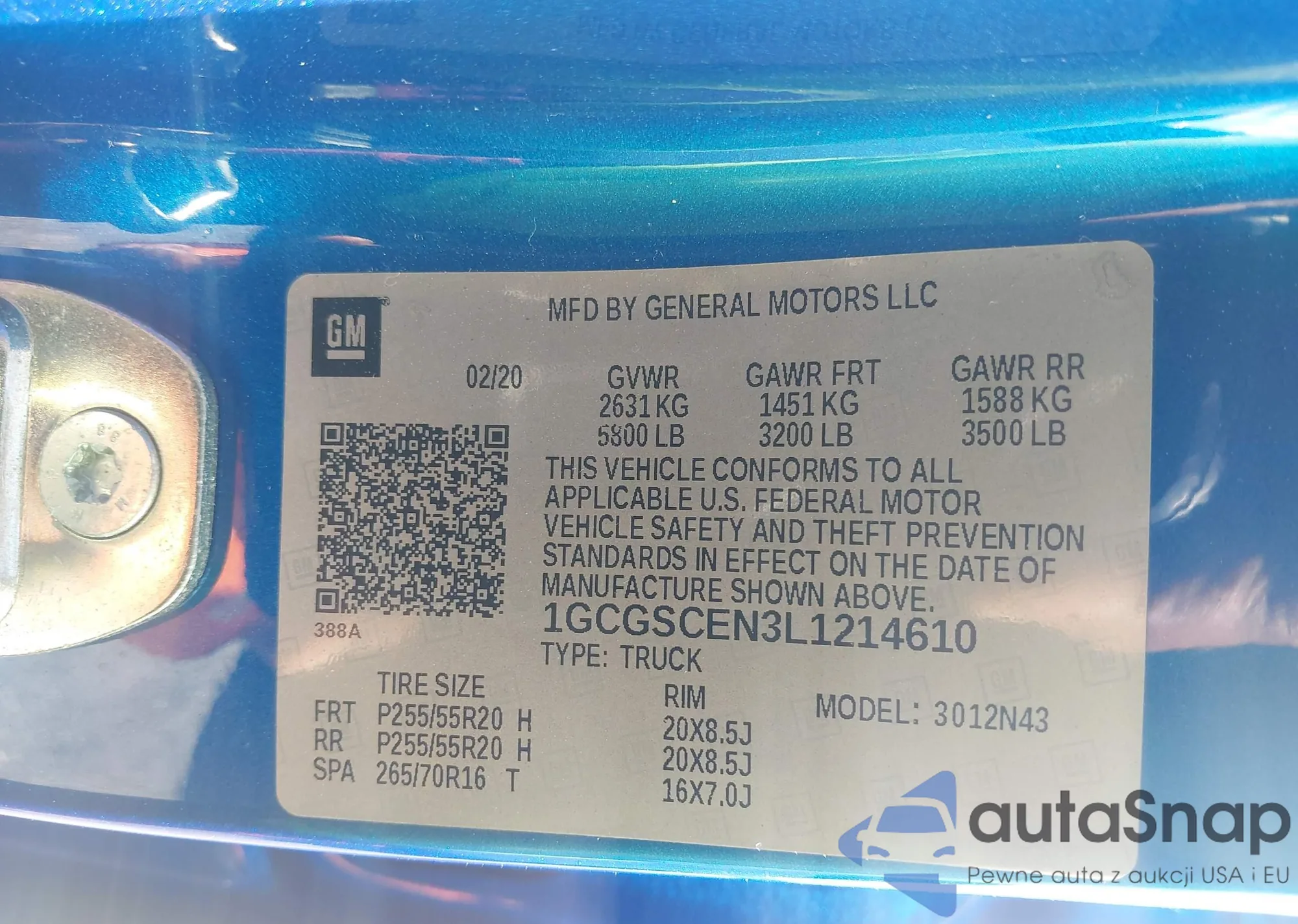 LOT: 41796734 VIN: 1GCGSCEN3L1214610