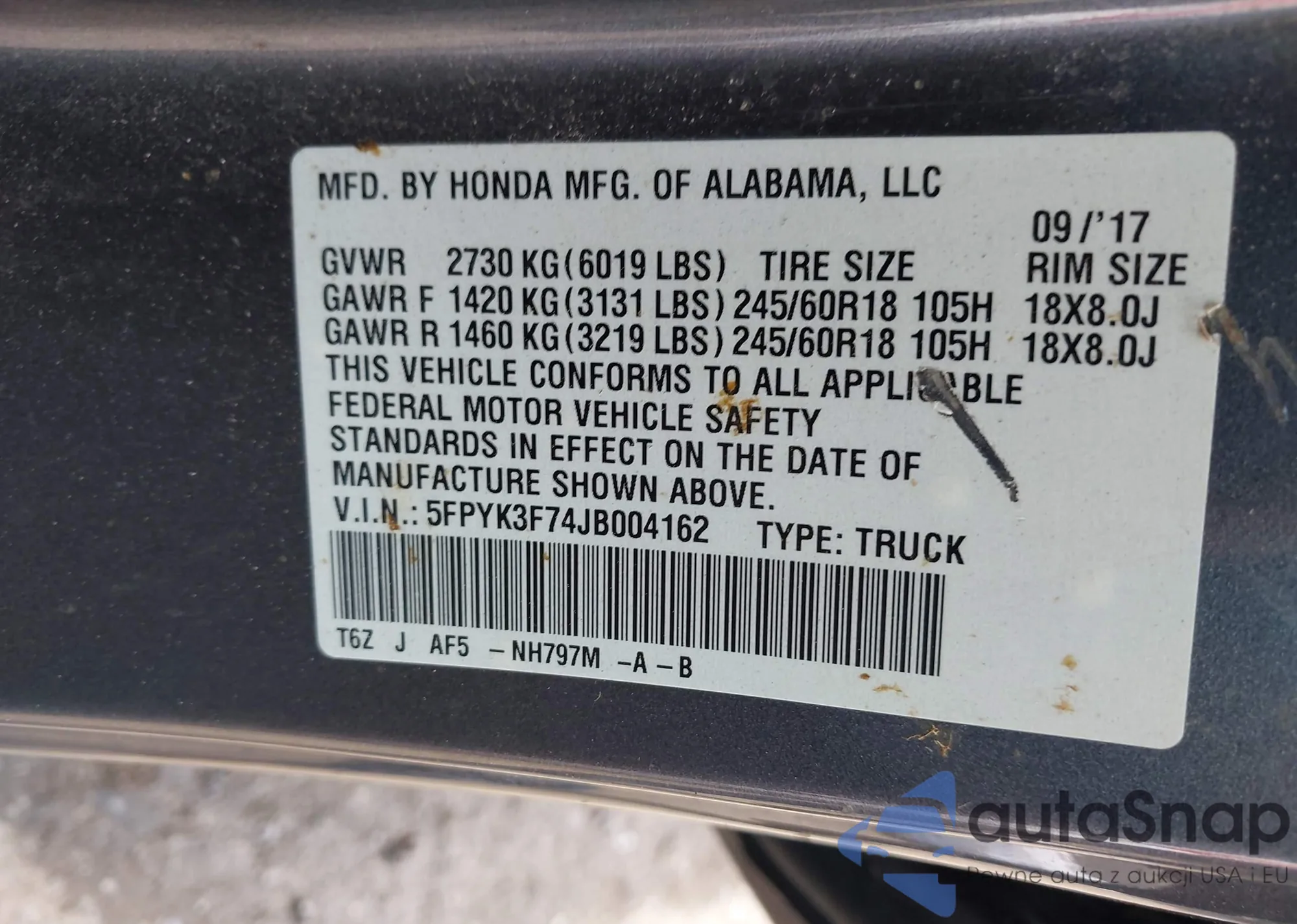 • VIN 5FPYK3F74JB004162