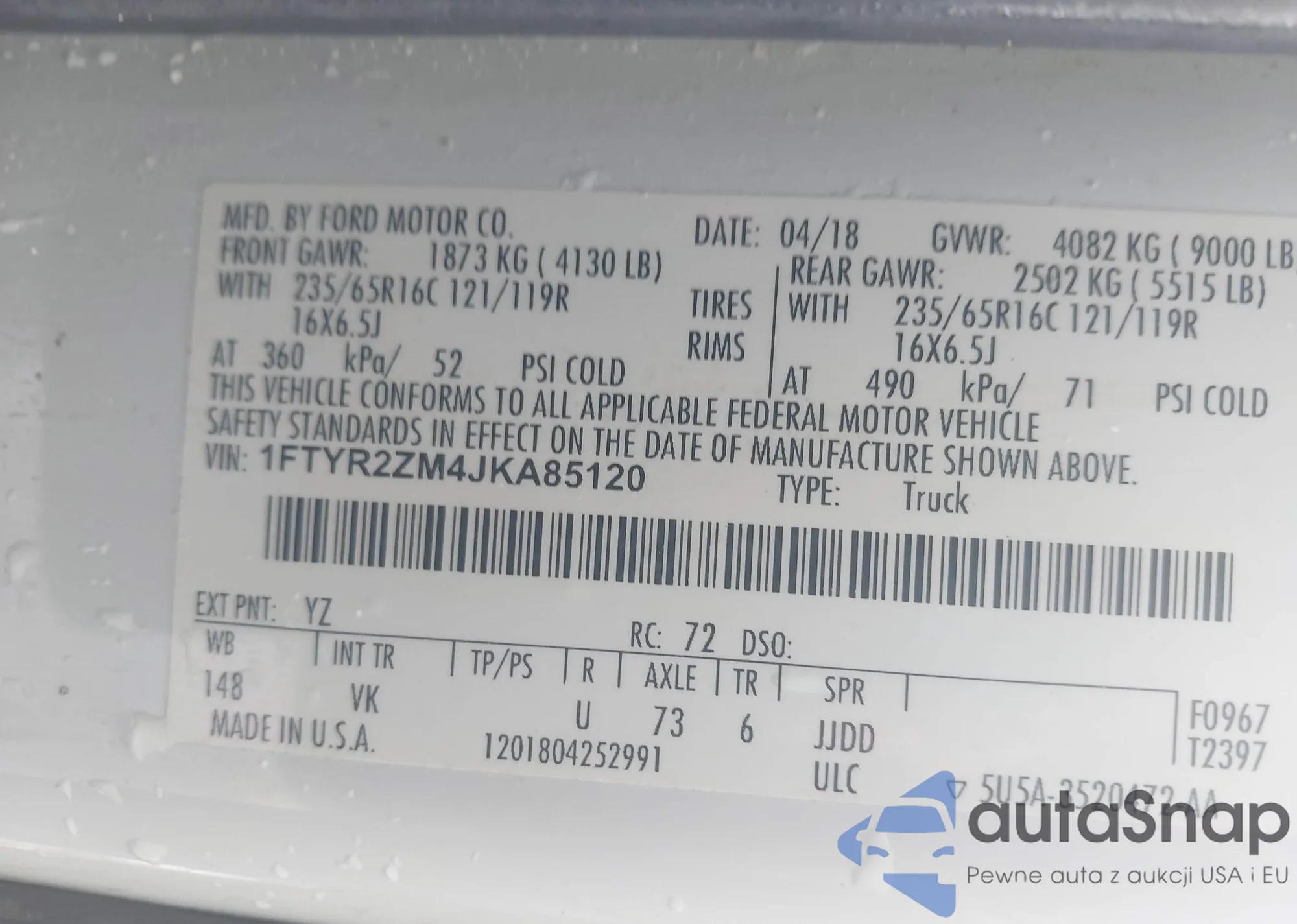 • VIN 1FTYR2ZM4JKA85120