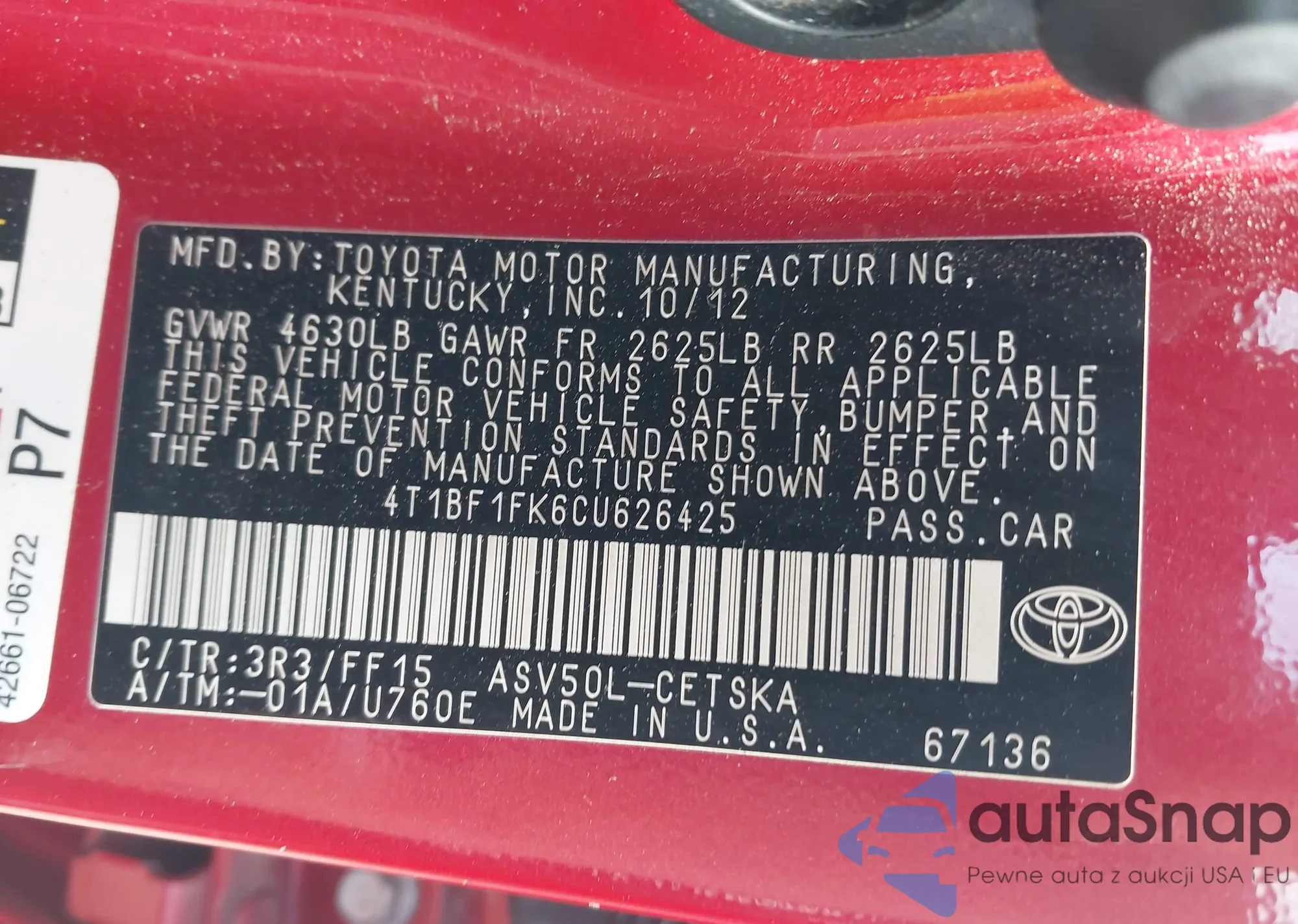 LOT: 42208683 VIN: 4T1BF1FK6CU626425