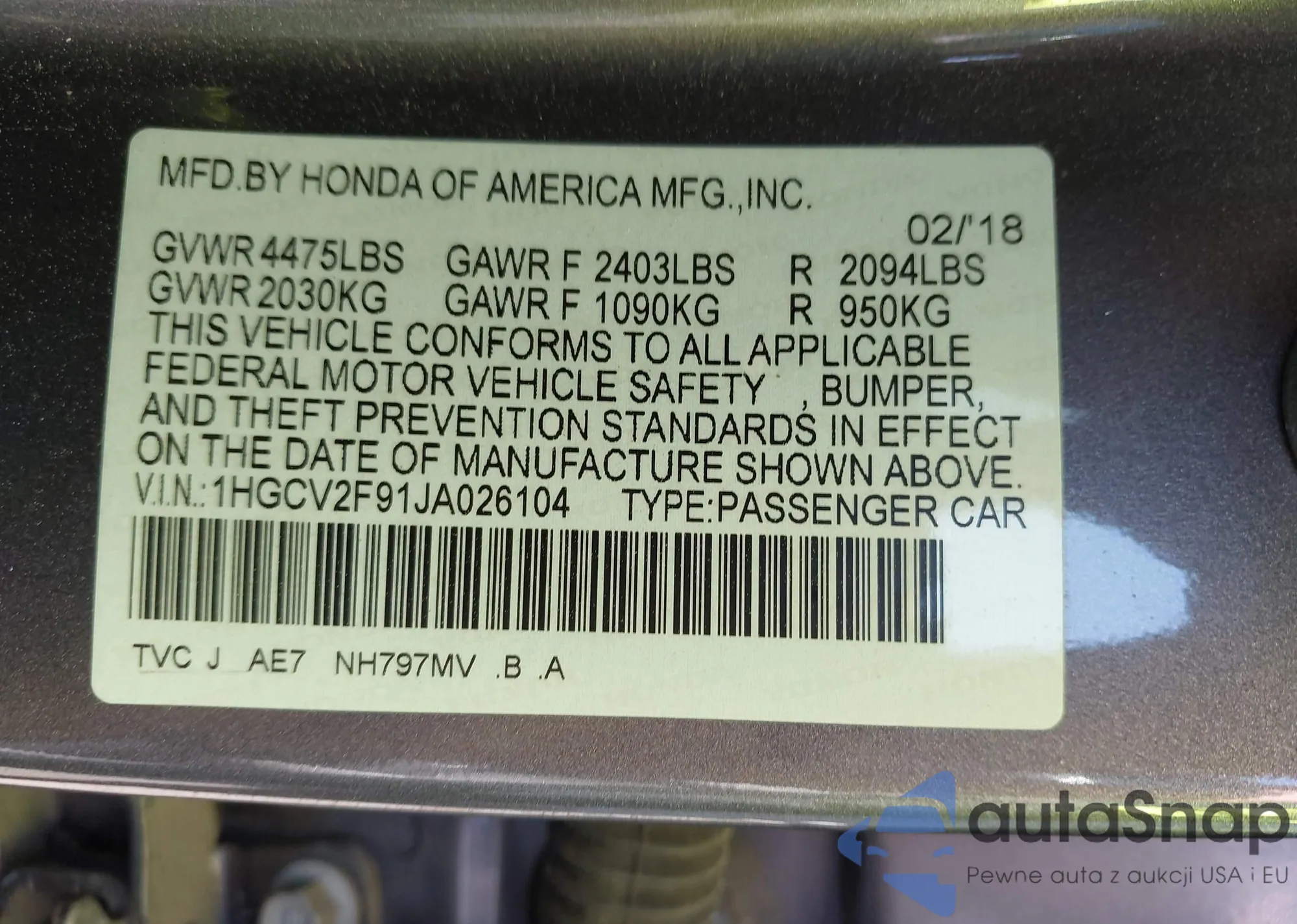 • VIN 5J6RW2H83MA014612