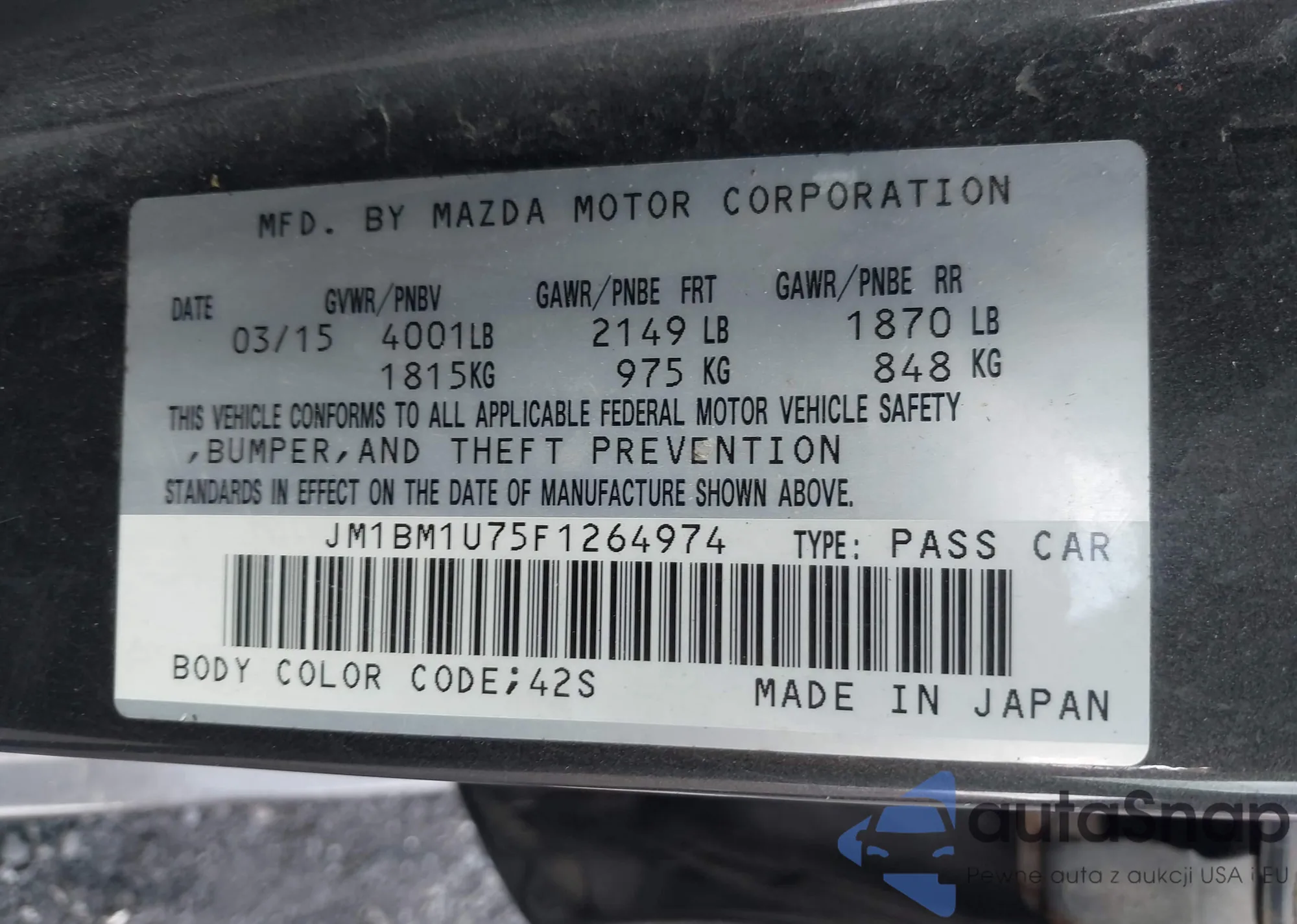 LOT: 42203538 VIN: JM1BM1U75F1264974