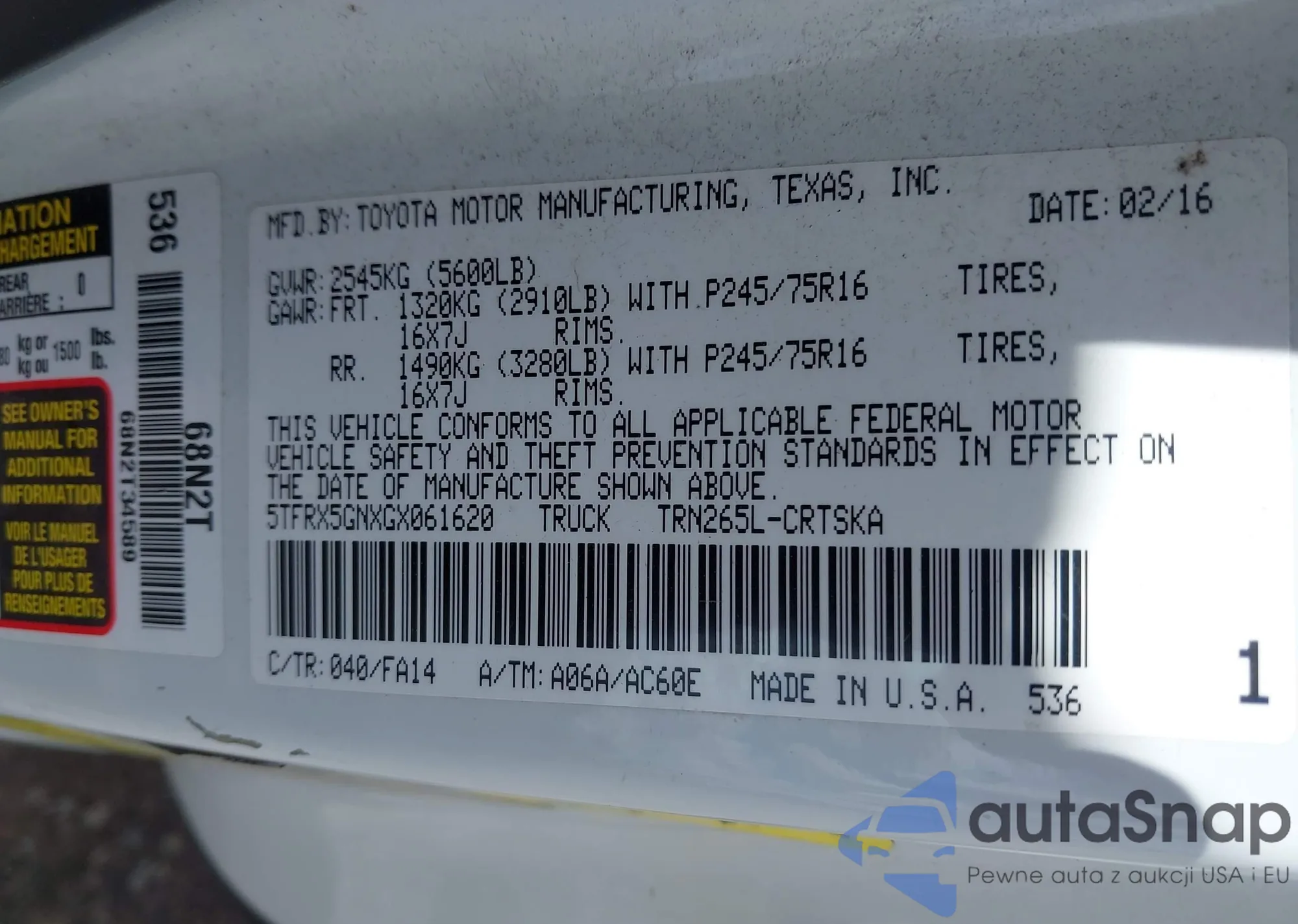 LOT: 42255448 VIN: 5TFRX5GNXGX061620