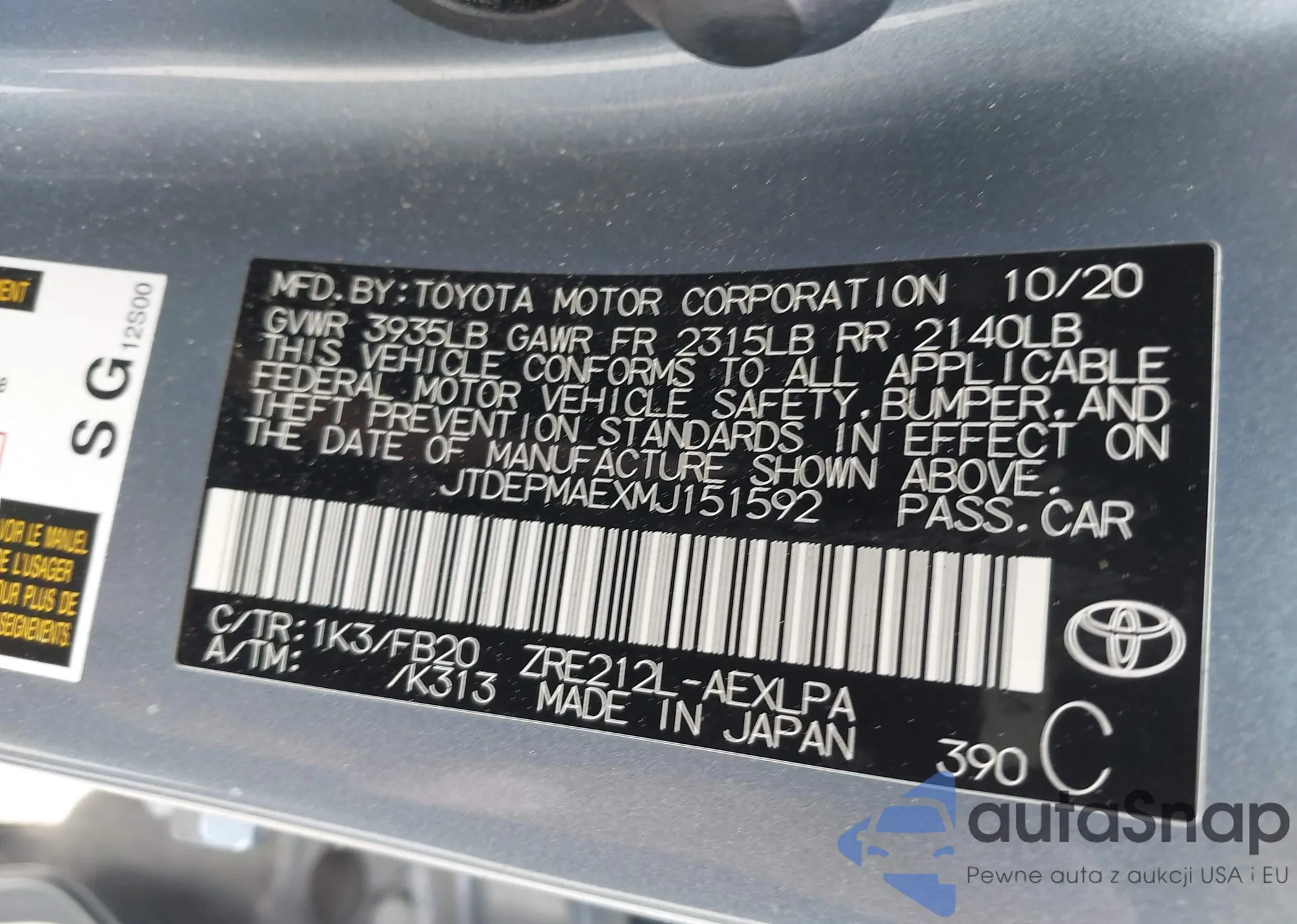 LOT: 41802474 VIN: JTDEPMAEXMJ151592
