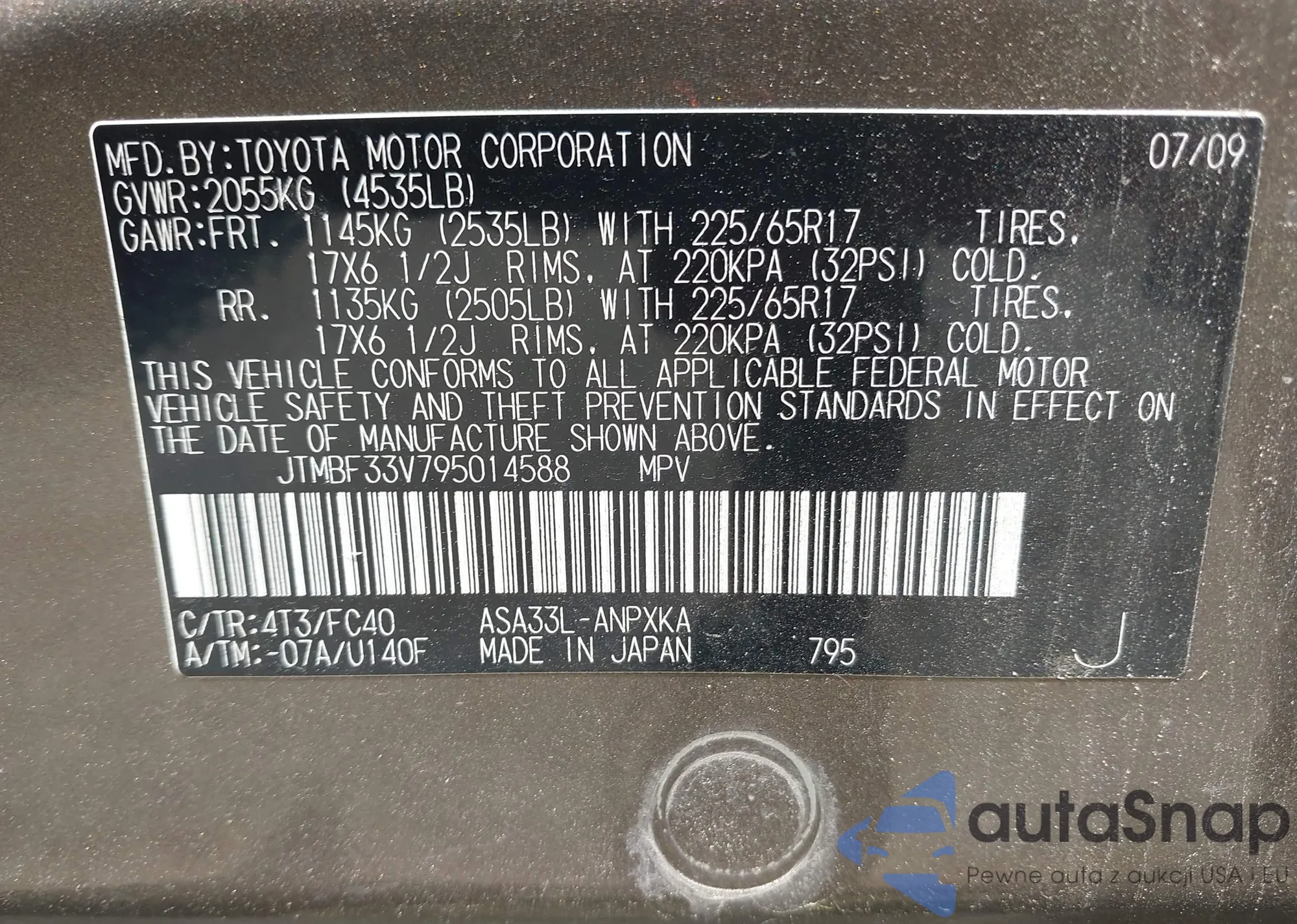 LOT: 42381853 VIN: JTMBF33V795014588