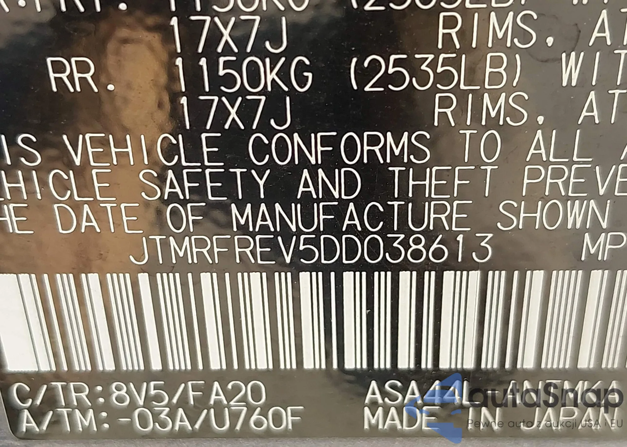 LOT: 42431086 VIN: JTMRFREV5DD038613