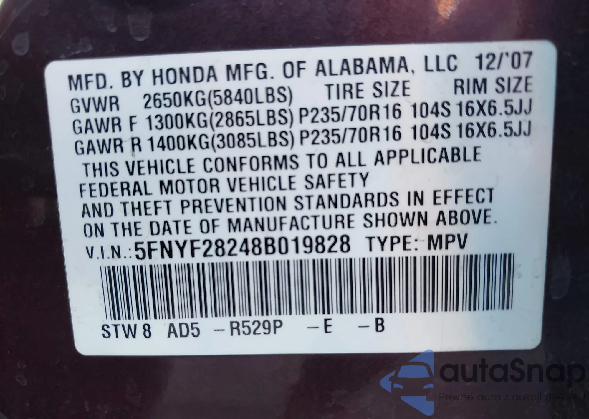 LOT: 42439414 VIN: 5FNYF28248B019828