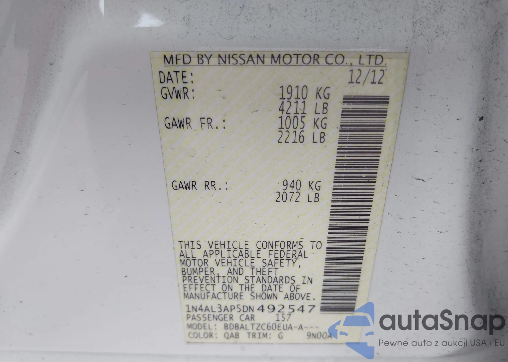 LOT: 42172220 VIN: 1N4BL4DV4KC122350