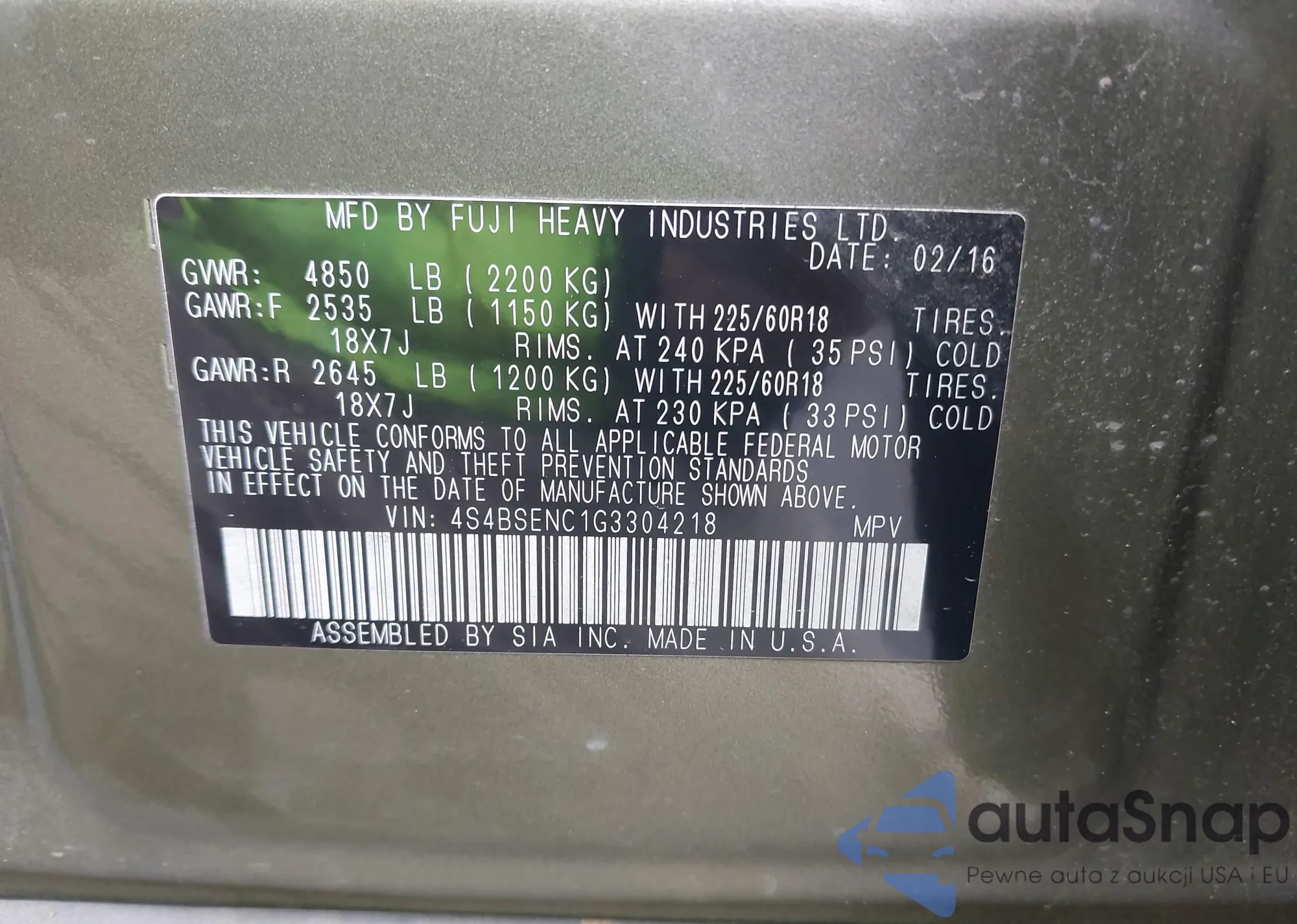 LOT: 41721885 VIN: 4S4BSENC1G3304218