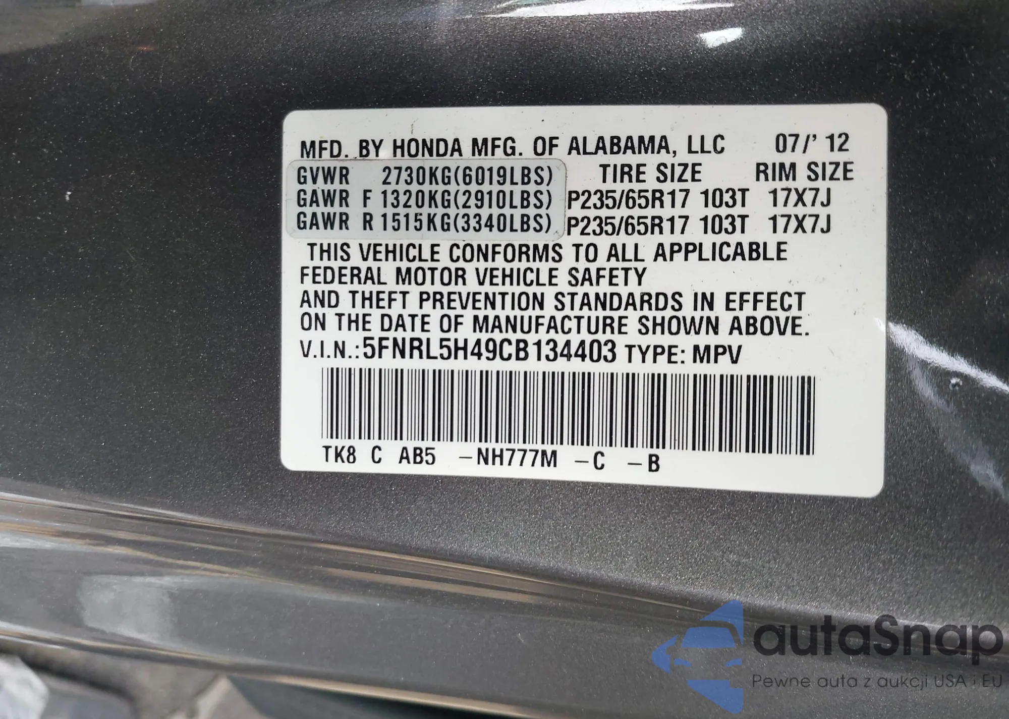 • VIN 5FNRL5H49CB134403