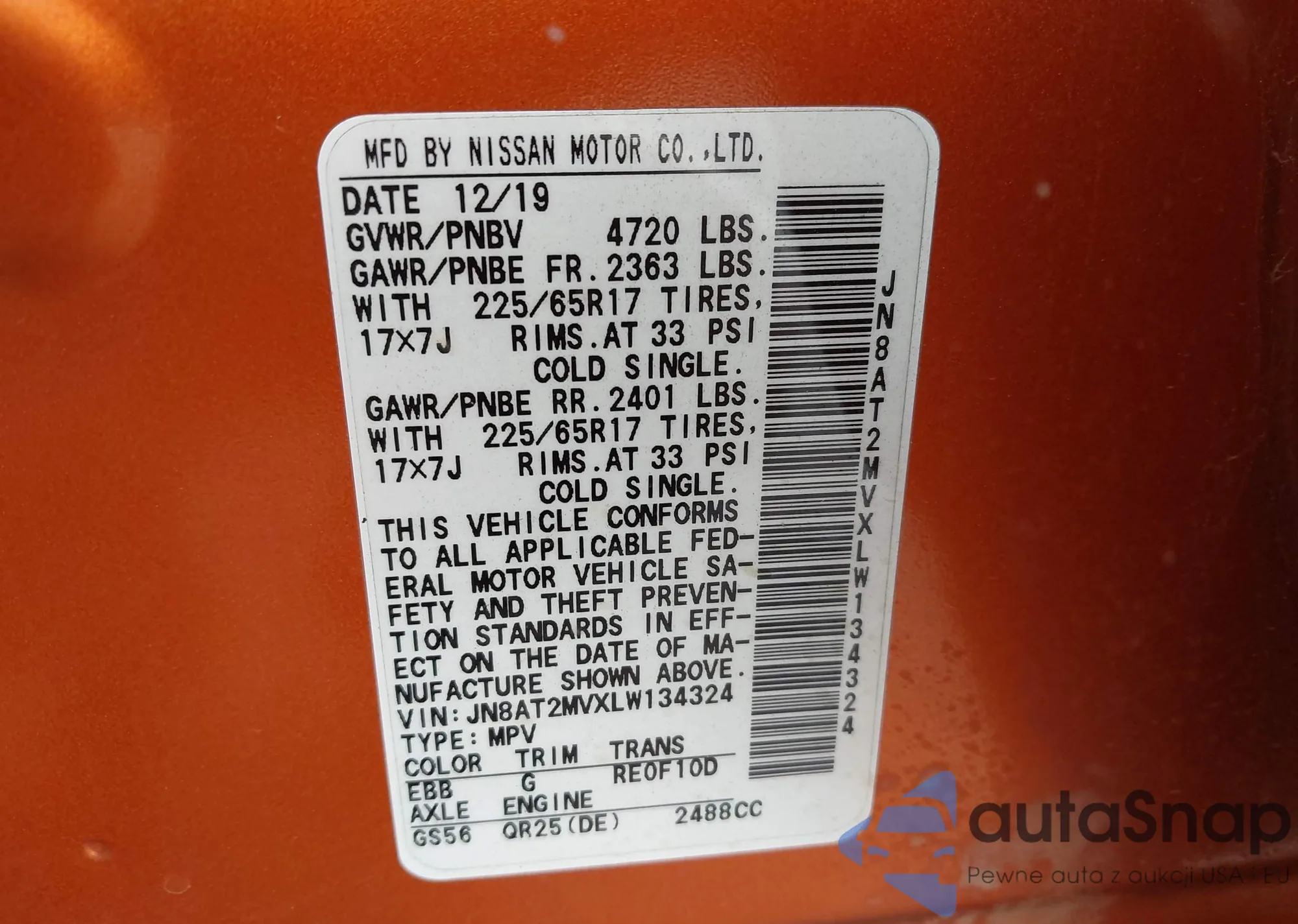 LOT: 42069457 VIN: JN8AT2MVXLW134324