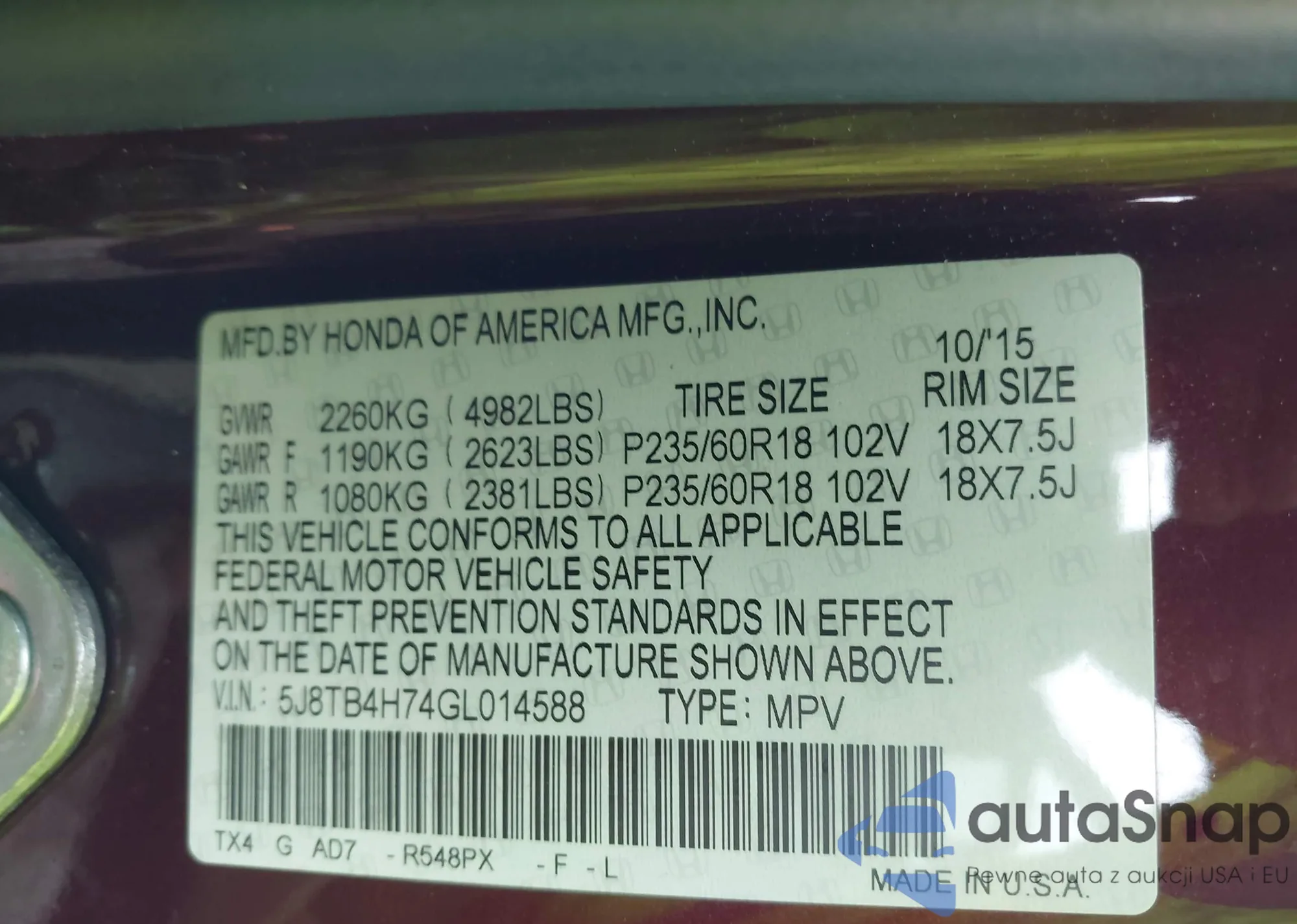 LOT: 42365333 VIN: 5FNRL5H20FB115905
